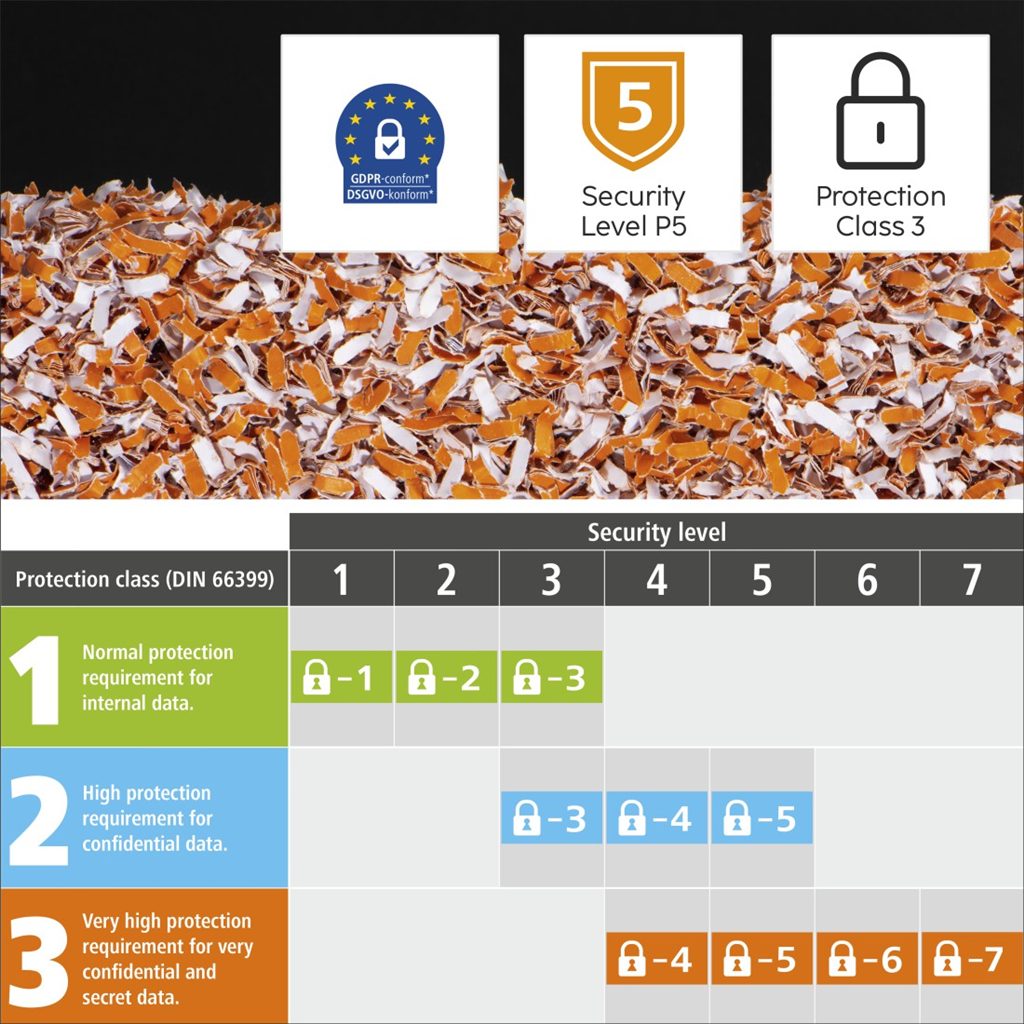 - bezpečné zničení důvěrných údajů podle normy DIN 66399; bezpečnostní úroveň P5 je vhodná pro zničení osobních dat v papírové formě podle GDPR (General Data Protection Regulation)