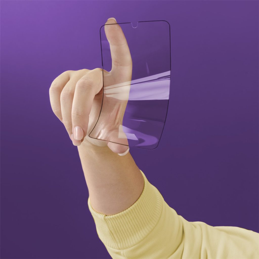 - vyřezáno pomocí laseru s takovou přesností, že výřezy, např. pro kameru, jsou minimalizovány, aby se zajistilo maximální pokrytí displeje
