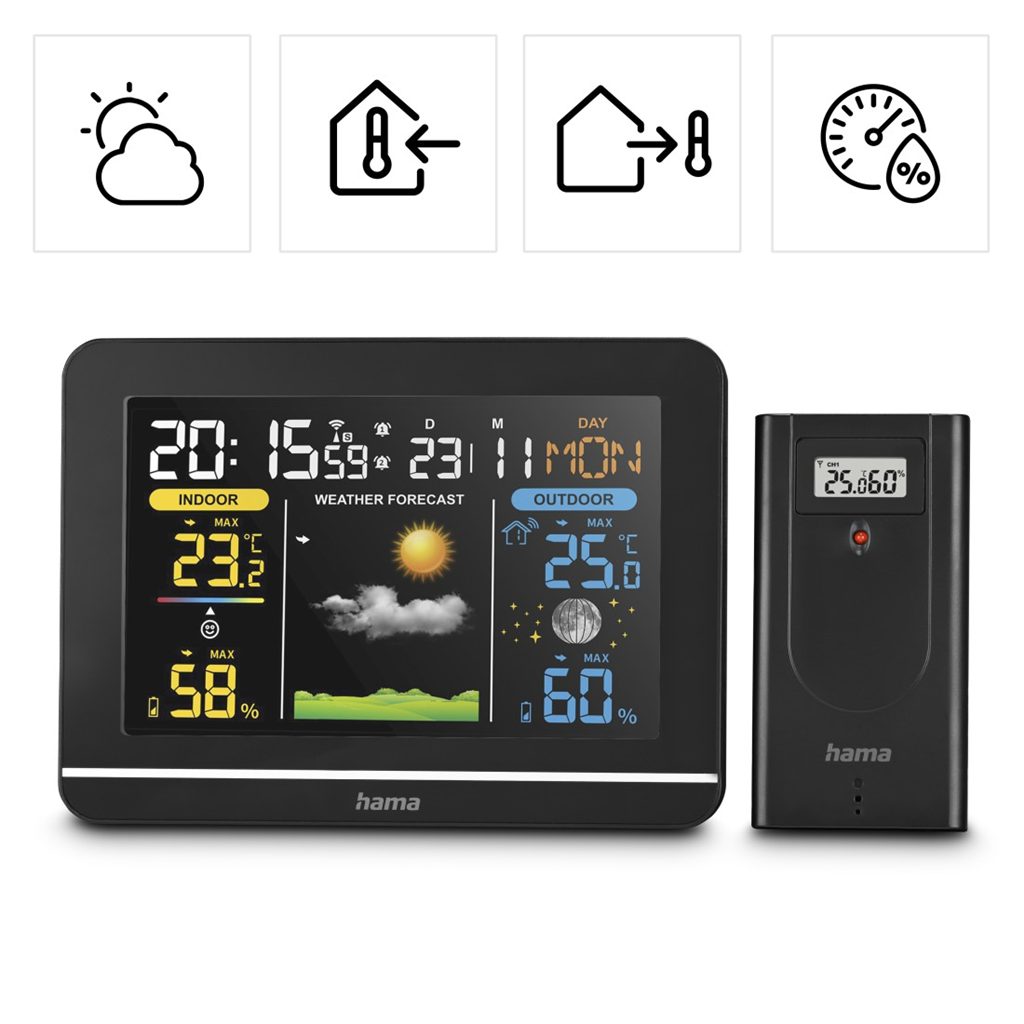 - pro digitální zobrazení venkovní a vnitřní teploty a vlhkosti vzduchu, předpovědi počasí, fáze měsíce, data, času a dne v týdnu