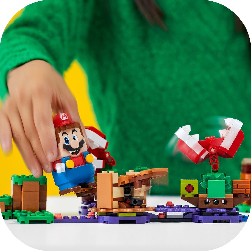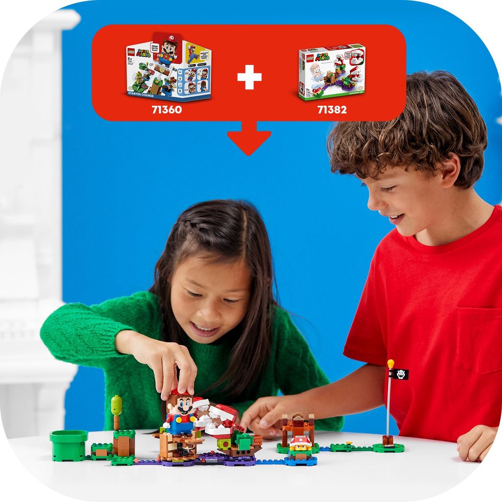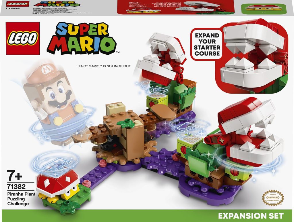 Vneste do světa LEGO® Super Mario™ ještě více zábavy, kterou lze sdílet i s kamarády. Kupte dětem Hlavolam s piraňovou rostlinou – rozšiřující set (71382). Obsahuje 2 piraňové rostliny a figurku Spinyho, kterou musí LEGO® Mario™ (není součástí) porazit. Dále je zde kolotoč, který odstraní piraňové rostliny z cesty a umožní hráčům dojít ke 3 červeným kostkám, jež nabízejí velkou odměnu v podobě digitálních mincí. (Poznámka: Pro interaktivní hraní je zapotřebí Startovací set 71360.)