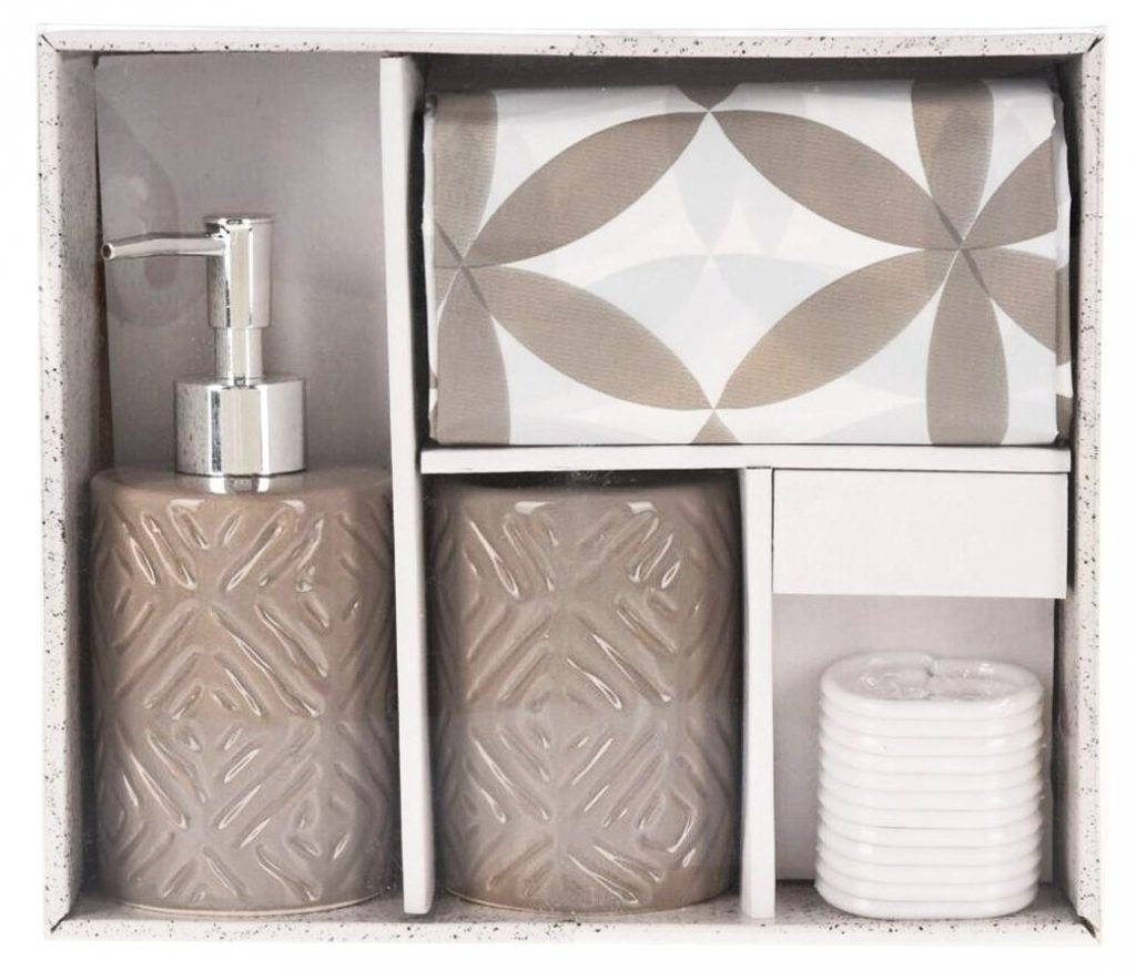 HOMESTYLING Koupelnové doplňky sada 3 ks hnědá KO-CY2210590hned - set koupelnových doplňků ve světle hnědé barvě- vyrobené z keramiky s lesklou glazurou, závěs z PEVA- v sadě najdete také 12 háčků pro jednoduché připevnění závěsu- rozměr sprchového závěsu 180 x 180 cm- sada obsahuje 3 ks- dávkovač na mýdlo- držák na zubní kartáčky- sprchový závěs + 12 x háček na závěs- barva: hnědá / bílá- značka: Homestyling