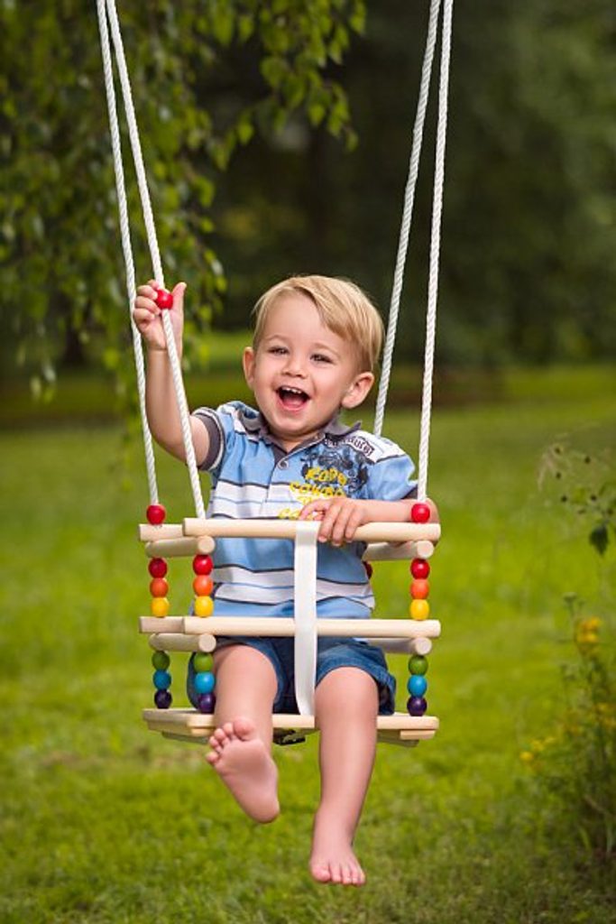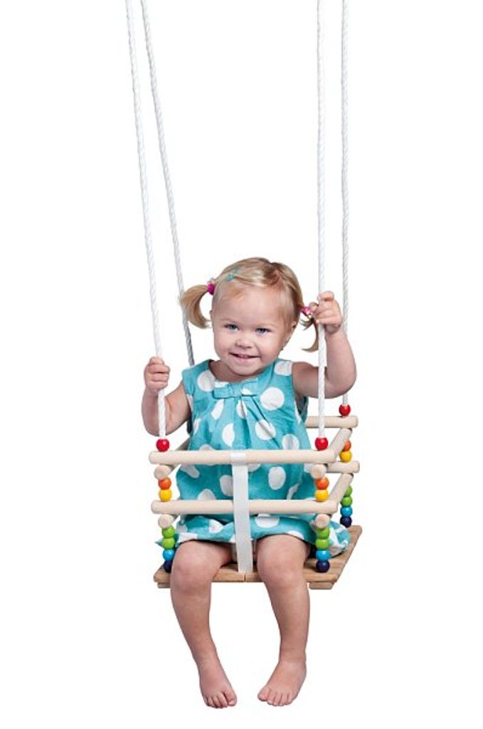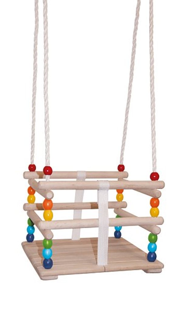 Houpačka pro nejmenší děti je vyrobena z masivního dřeva. Je opatřena bezpečnostní ohrádkou a popruhem umístěným mezi nohami dítěte, který zabraňuje vyklouznutí dítěte z houpačky. Houpačka má nastavitelnou délku lan. Je vhodná do interiéru i exteriéru. Je určena pro zavěšení na bezpečnostní (nejlépe točivé) háky, které však nejsou součástí balení. Vyrovná se uvolněním šňůry.