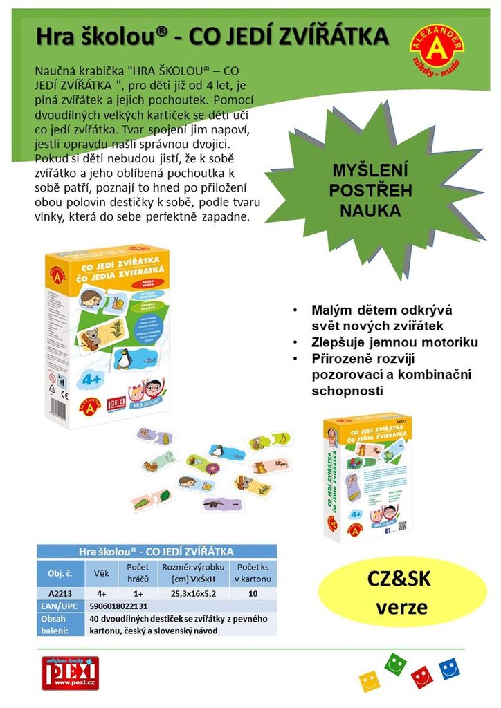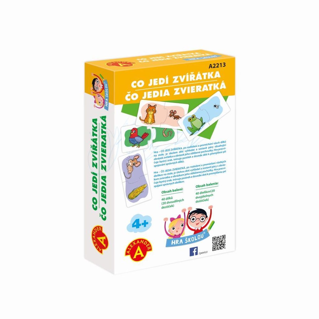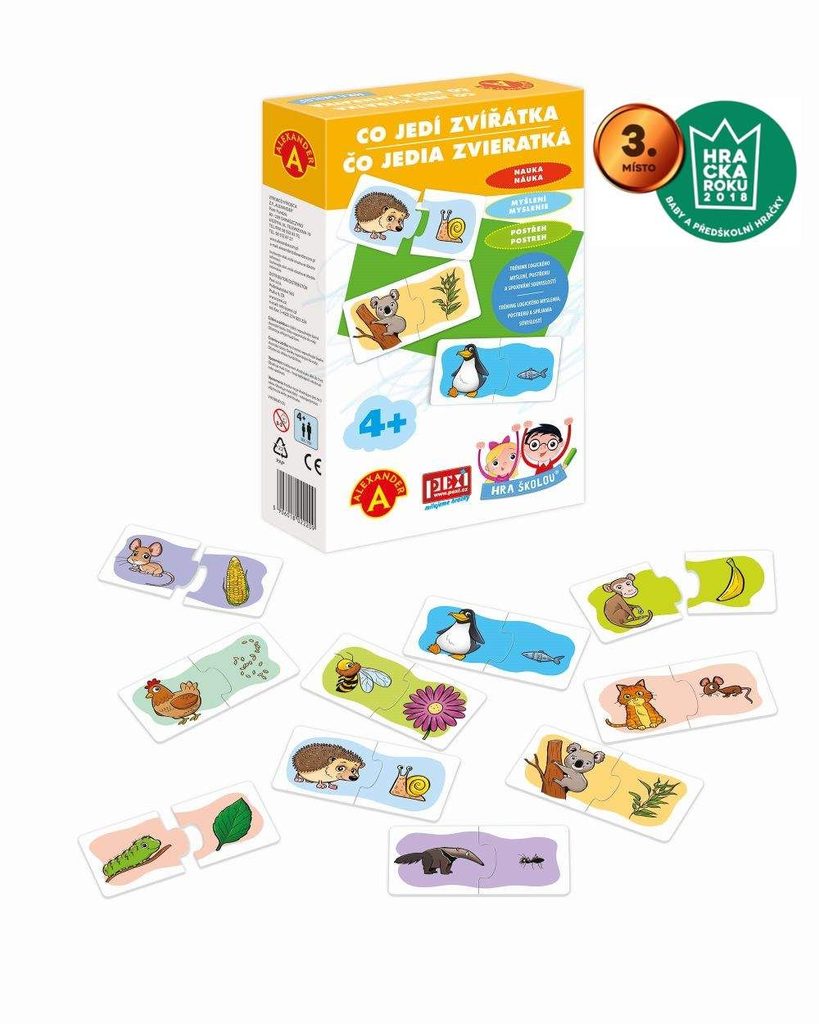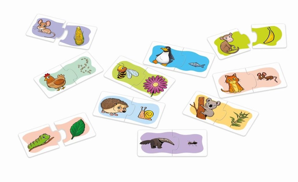 Obsah balení: 20 pevných kartiček rozdělených na poloviny s kreslenými motivy dvojic: osel + seno, lev + maso, veverka + oříšek, mravenečník + mravenec, koala + listy blahovičníku, panda + list bambusu, opice + banán, žába + moucha, včela + květ, ježek + hlemýžď, kráva + tráva, myš + kukuřice, čáp + kobylka, tučňák + ryba, stonožka + zelený keř, zajíc/králík + mrkev, pes + kost, slepice + zrní, pták + žížala, kočka + myš, dále uzavíratelný sáček + krabička s ukázkami kreslených motivů.