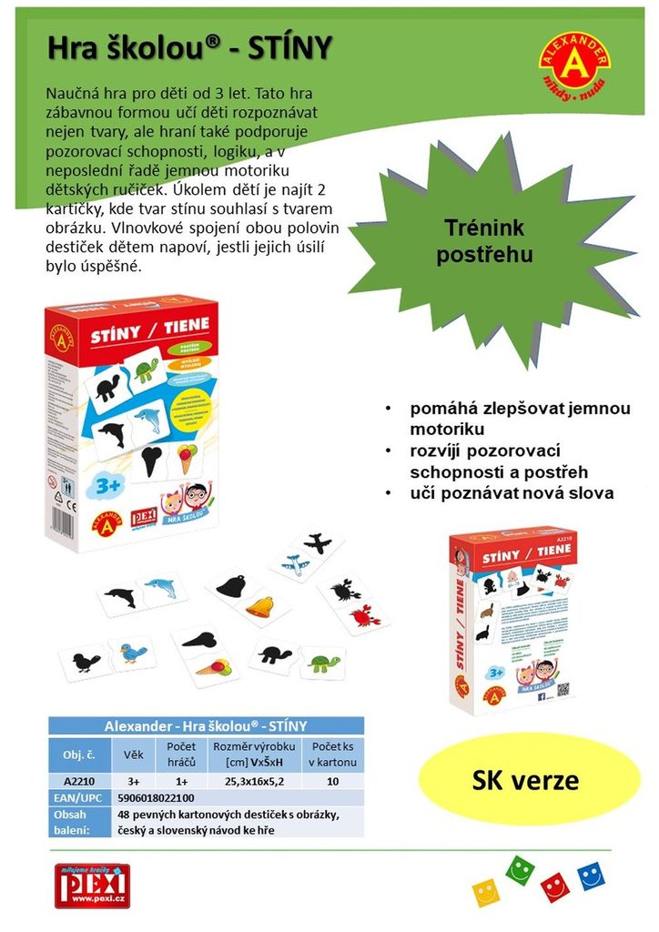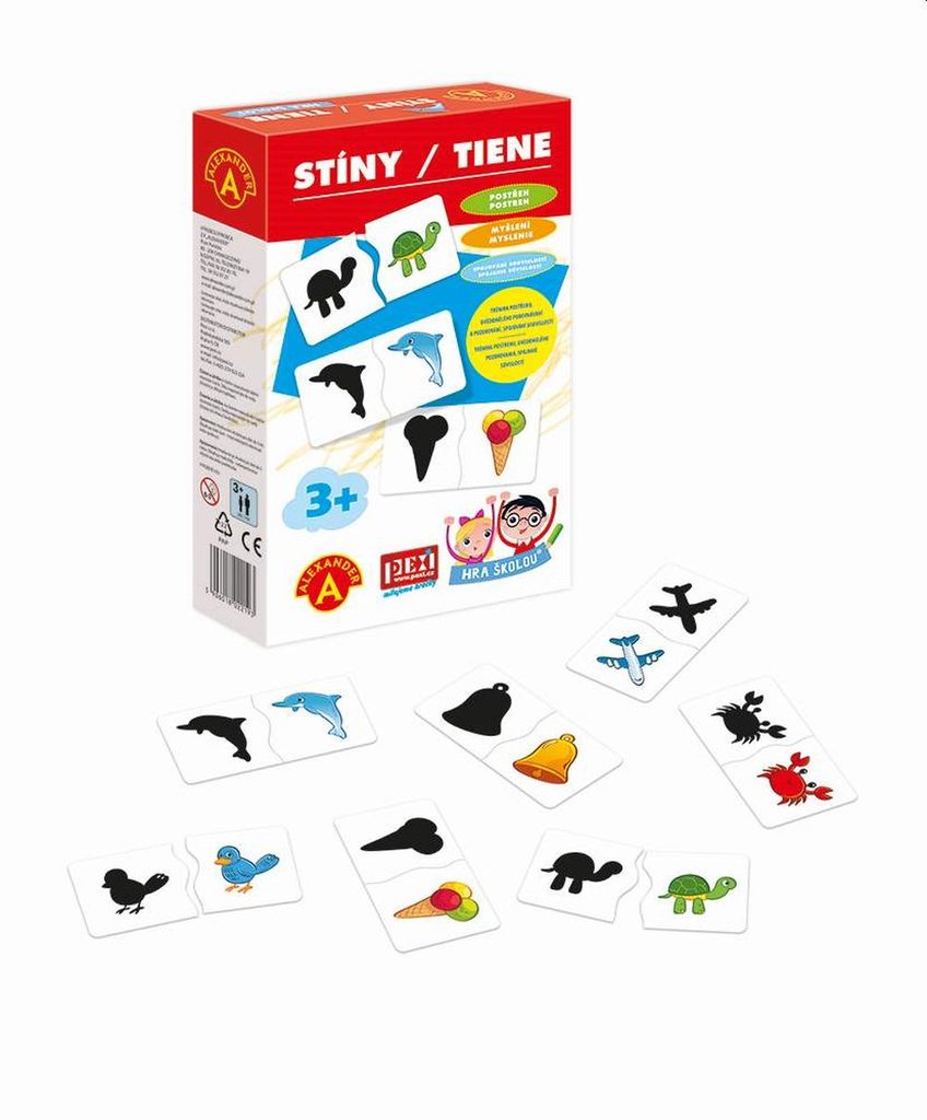 HRA ŠKOLOU® - STÍNY je naučné hraní pro malé objevitele od 3 let rozvíjí kombinační schopnosti, pozorování a postřeh. Sestav a poznej 24 dvojic složených ze stínu a barevného obrázku zvířat, hudebních nástrojů a věcí z každodenního života.