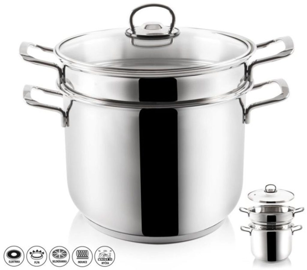 Kvalitní nerezový hrnec ANETT se skleněnou poklicí složený z velkého hrnce a dílu s otvory oceníte při vaření různých druhů těstovin, brambor i zeleniny. Je vhodný do myčky. Rozměry: v. 26cm (s…