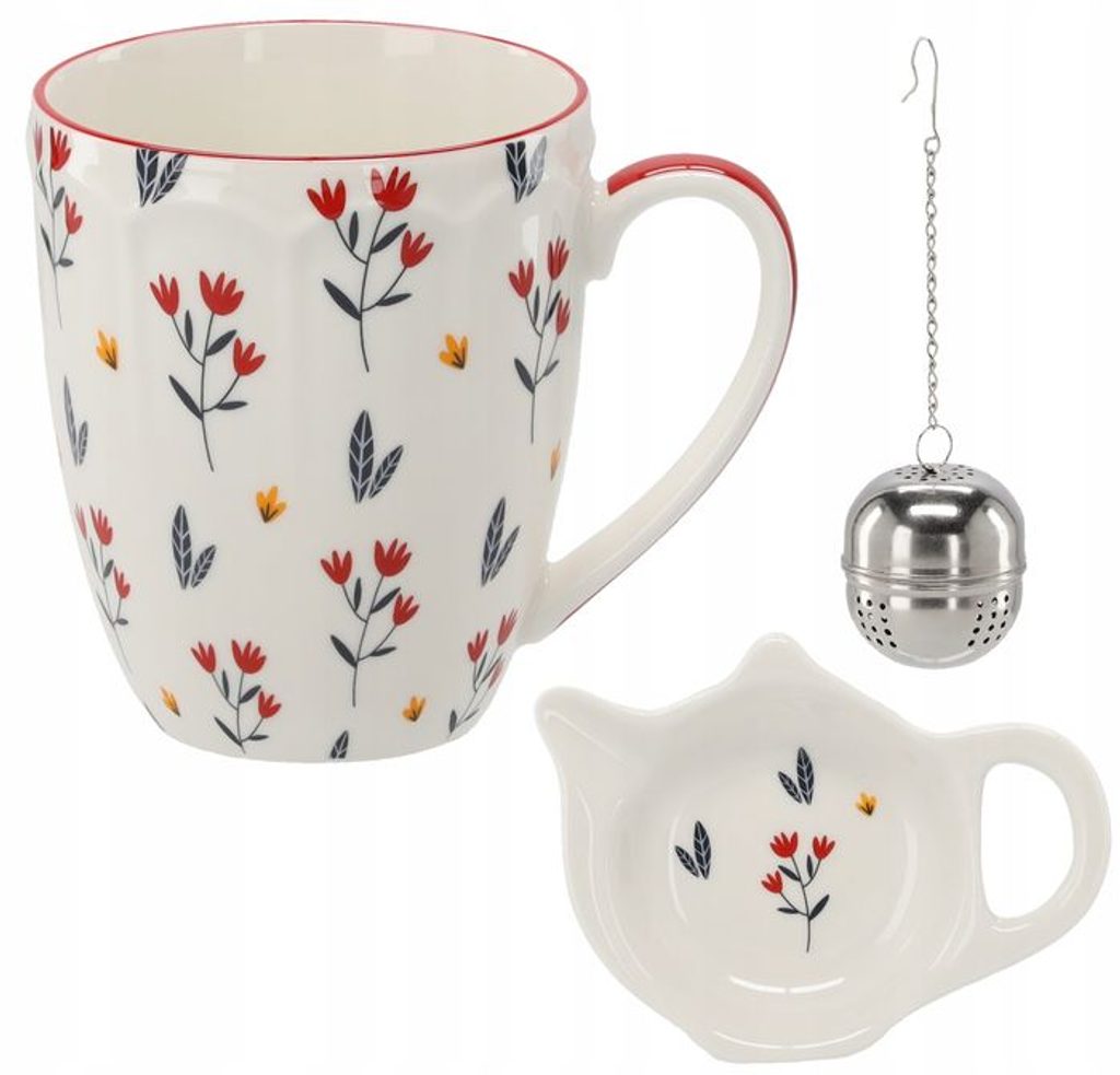 - hrnek 350ml KVĚTY, 3DEKORY, čajítko, podčajník, porcelán, DB