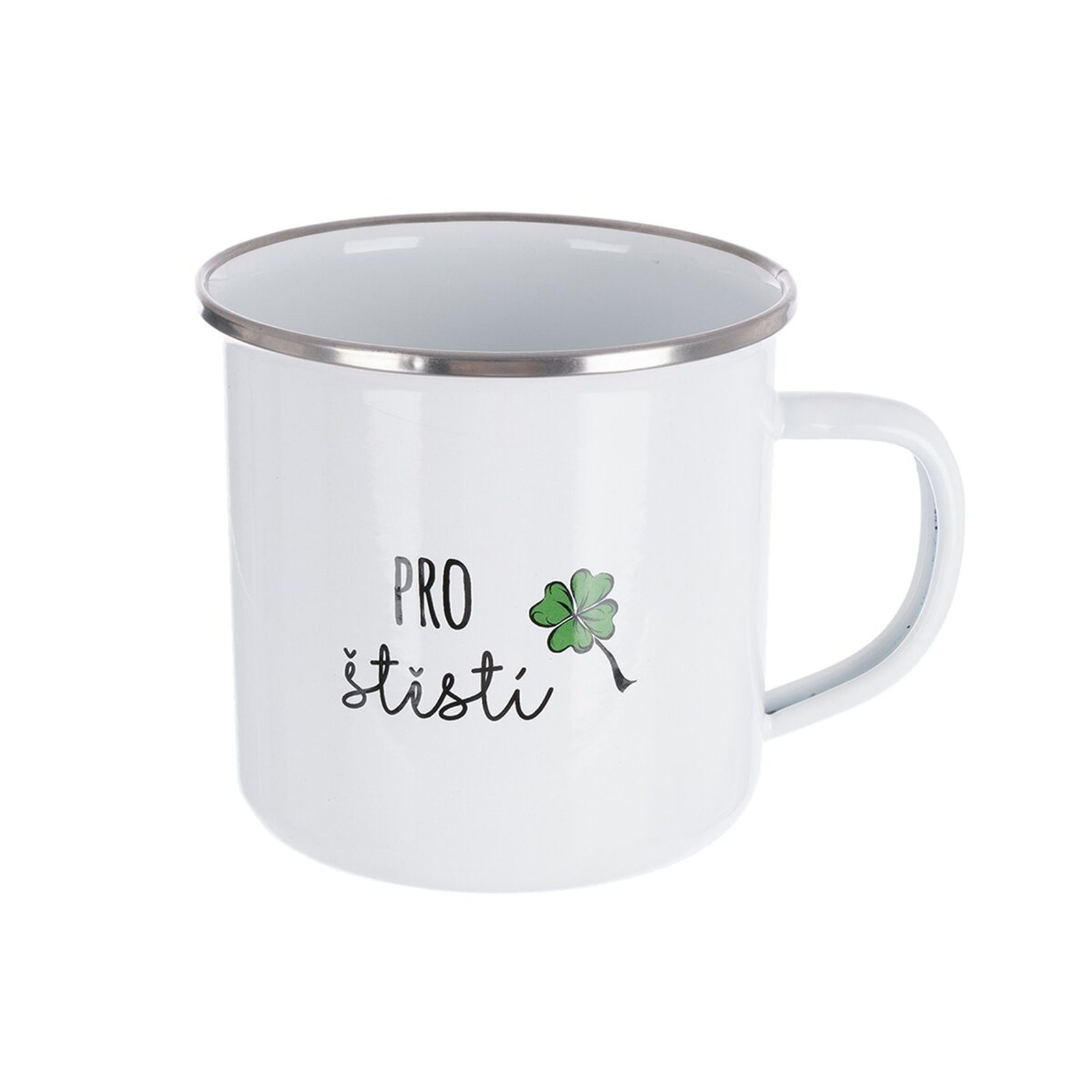 Smaltovaný rovný hrnek s uchem a dekorem PRO ŠTĚSTÍ je stylovým a zároveň praktickým doplňkem pro každodenní používání i jako milý dárek. Klasický design doplňuje nápis, který potěší a vykouzlí úsměv při každém napití. Materiál: smaltovaný plech, nerezová ocel. Rozměry: pr. 9,7 cm, v. 9,2 cm, o. 570 ml. Není vhodný do MVT, trouby, myčky nádobí a mrazáku. Designed by Orion.