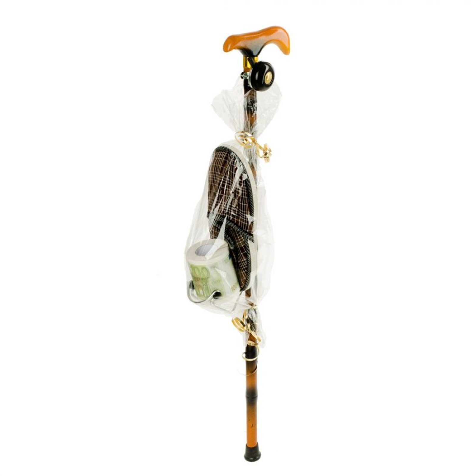 Praktický a vtipný dárek pro každou babičku a dědečka. Chodicí hůl se zvonkem je montována v České republice, spolu s ní v této dárkové sadě naleznete držák na láhev, toaletní papír s potiskem 100 EUR a bačkory. Zábavný dárek, který se hodí jako vánoční dárek, dárek k narozeninám, svátku nebo jen tak pro radost.