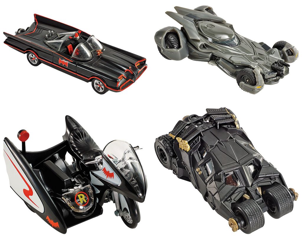 Toto jsou naprosto skvělé repliky populárních vozidel Batmana! Oslavy k 50. výročí vzniku prvního klasického televizního seriálu o Batmanovi a dalších kultovních vozidel od DC Universe jsou v plném proudu. Mezi modely v měřítku 1:50 ze sběratelské kolekce patří Batmobil z Batmana, z Batmana navždy a z trilogie Temný rytíř. A nemůžeme zapomenout ani na úžasný Batmobil z nového filmu Batman V Superman: Úsvit spravedlnosti! Tato kolekce oslavující 50 let od vzniku batmanových vozidel nesmí chybět žádnému sběrateli Hot Wheels ani milovníkovi Batmana – kromě Batmobilu jsou v nabídce i Batboat, Batcycle a Batcopter! Vyber si své oblíbené vozidlo, nebo je posbírej všechny a vytvoř si ohromující sbírku! Bude těžké vybrat jen jeden nebo dva.