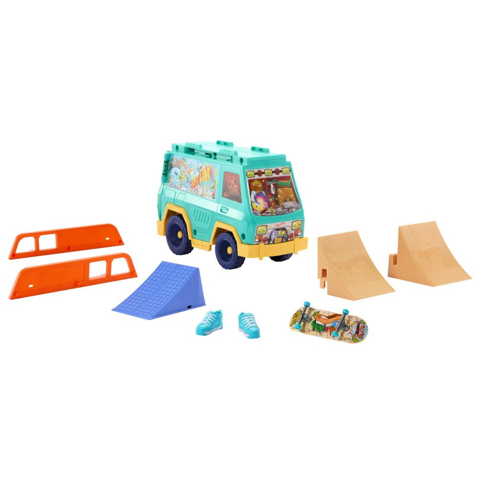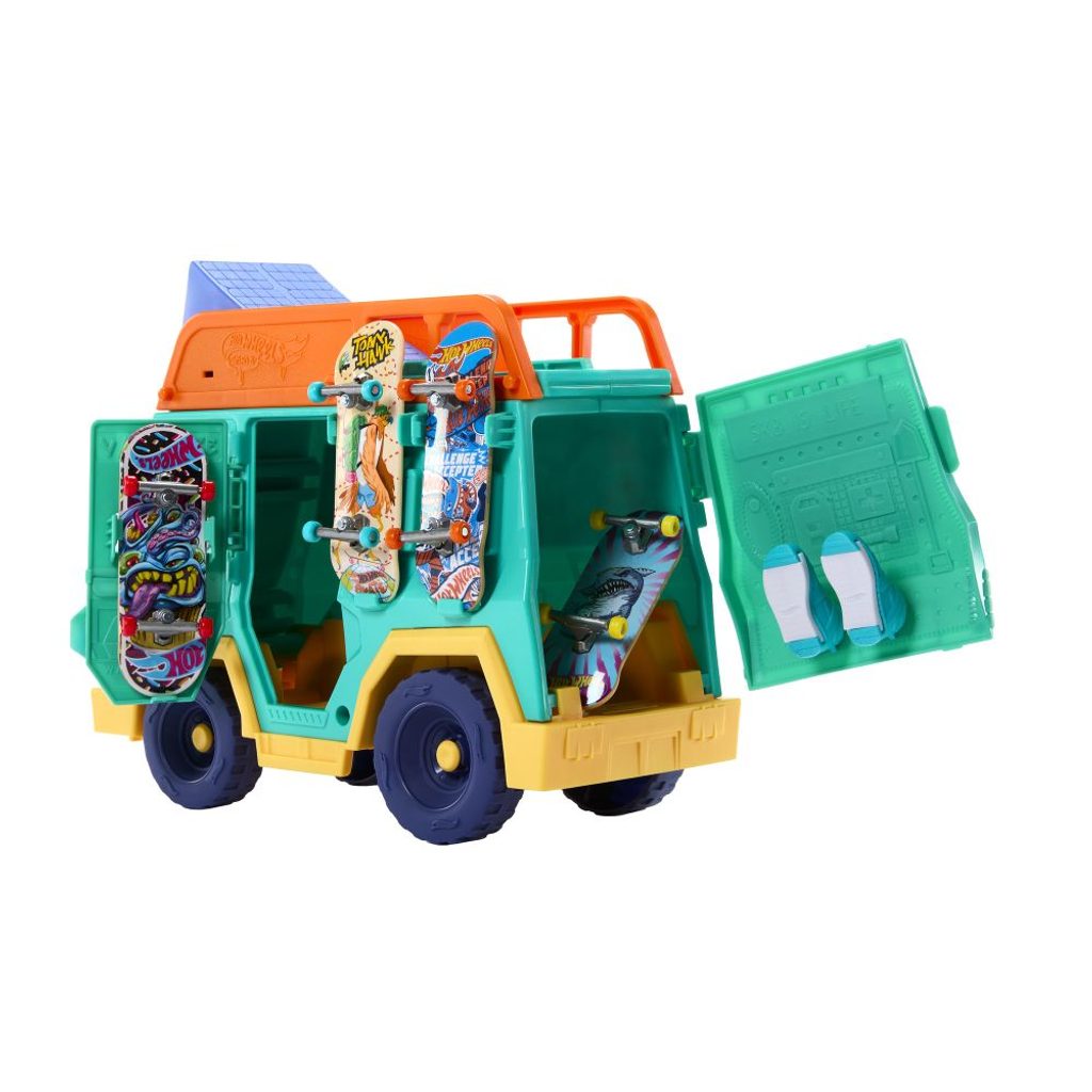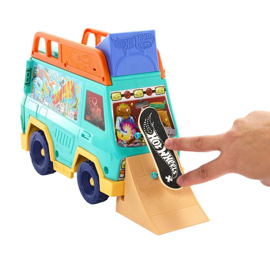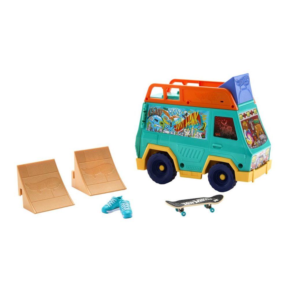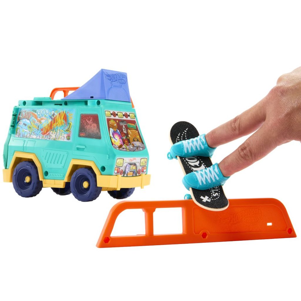 Připravte si scénu pro parádní fingerboarding s herním setem Hot Wheels! Tahle pojízdná dodávka byla navržena ve spolupráci s legendou skateboardingu Tony Hawkem, takže vás čeká pořádná dávka stylu i akce. Uvnitř najdete dvě nájezdové rampy, odnímatelné grind raily, kolejnici na střeše, exkluzivní fingerboard a odnímatelné skate boty pro ještě lepší ovládání. Raily i rampy můžete libovolně přesouvat a kombinovat, takže vás pokaždé čeká nová jízda i triky. Celý povrch dodávky je navíc uzpůsobený k ježdění – fantazii se meze nekladou. Všechny doplňky snadno uložíte přímo do dodávky, takže nic neztratíte a můžete si ji vzít kamkoli s sebou. Barvy a vzhled výrobku se mohou lišit.