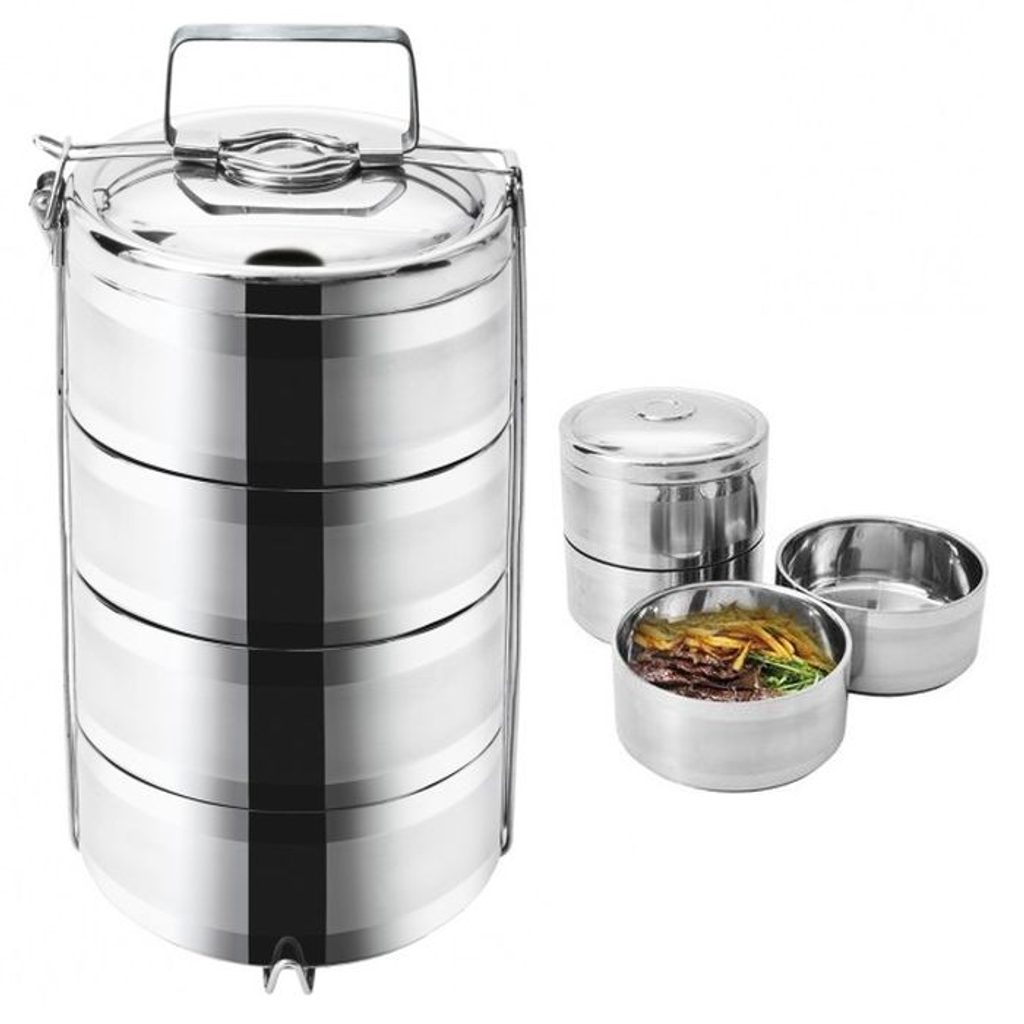 Termojídlonosič 4 patra pro přenášení pokrmů dlouho zachová jejich teplotu. Součástí je kovový stojan, opatřený přezkou, která zajistí jeho pevné uzavření a vrchní poklice.