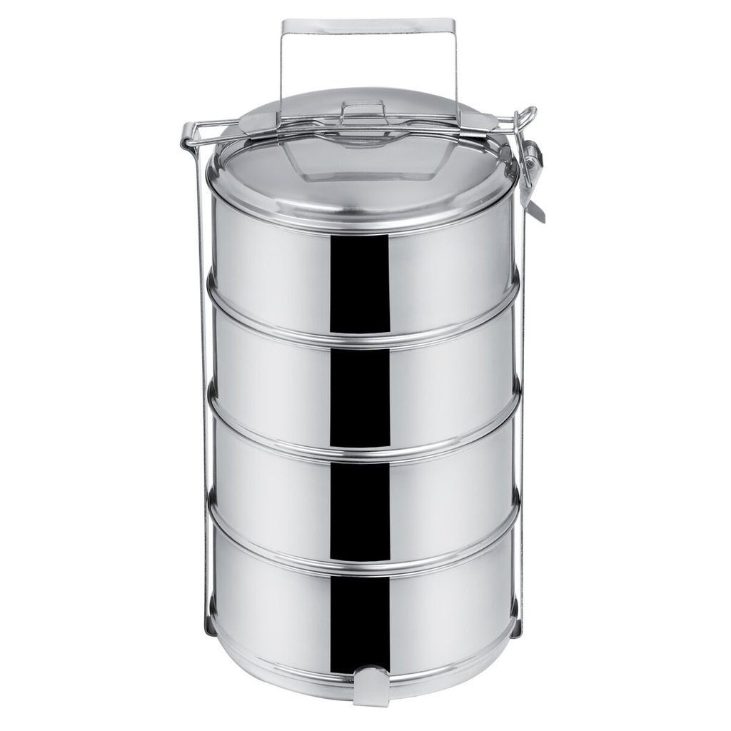 Jídlonosič 4 patrový celo nerezový je určený na přenášení potravin. Součástí je poklička a 3 další víčka na misky, kovový stojan s přezkou, která zajistí jeho pevné uzavření. Materiál: nerez. Rovné provedení. Rozměry: objem jednotlivých misek 1,3 l, miska pr. 16 cm, v. 6,5 cm, celková výška 33,5 cm. Vhodný do myčky na nádobí. Není určen k ohřevu jídla.