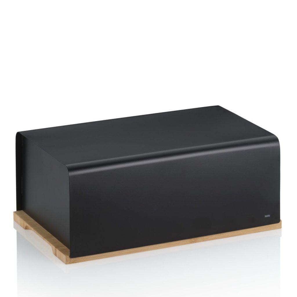Moderní víko: Obdélníkové černé kovové víko se jednoduše umístí na základnu jako digestoř. Chrání váš chléb před vysycháním a dodává chlebníku moderní stylový vzhled.