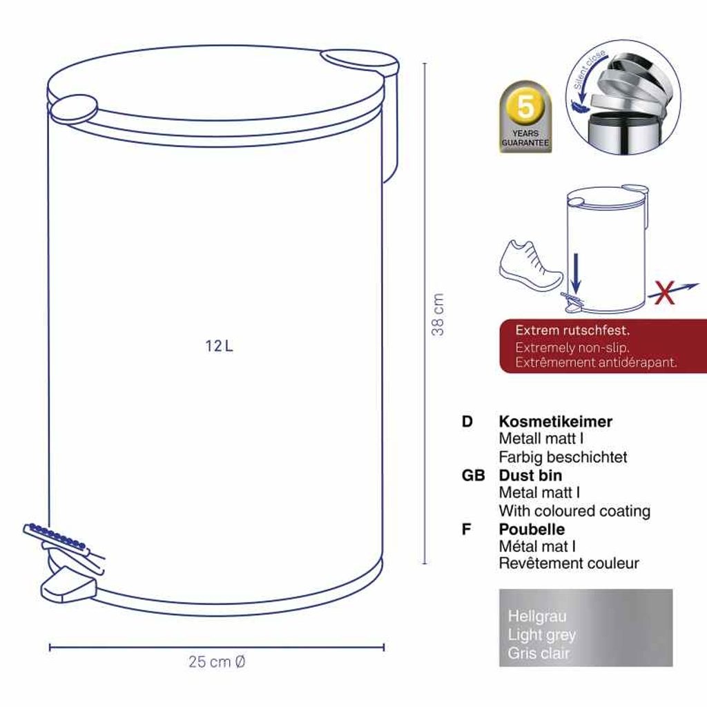 Pedálový koš Mats ve světle šedé barvě s matnou povrchovou úpravou přináší moderní vzhled a praktičnost do každé domácnosti či kanceláře. Díky systému tichého zavírání se víko zavírá plynule a bez hluku. Protiskluzová základna navíc zajišťuje stabilitu při každodenním používání.