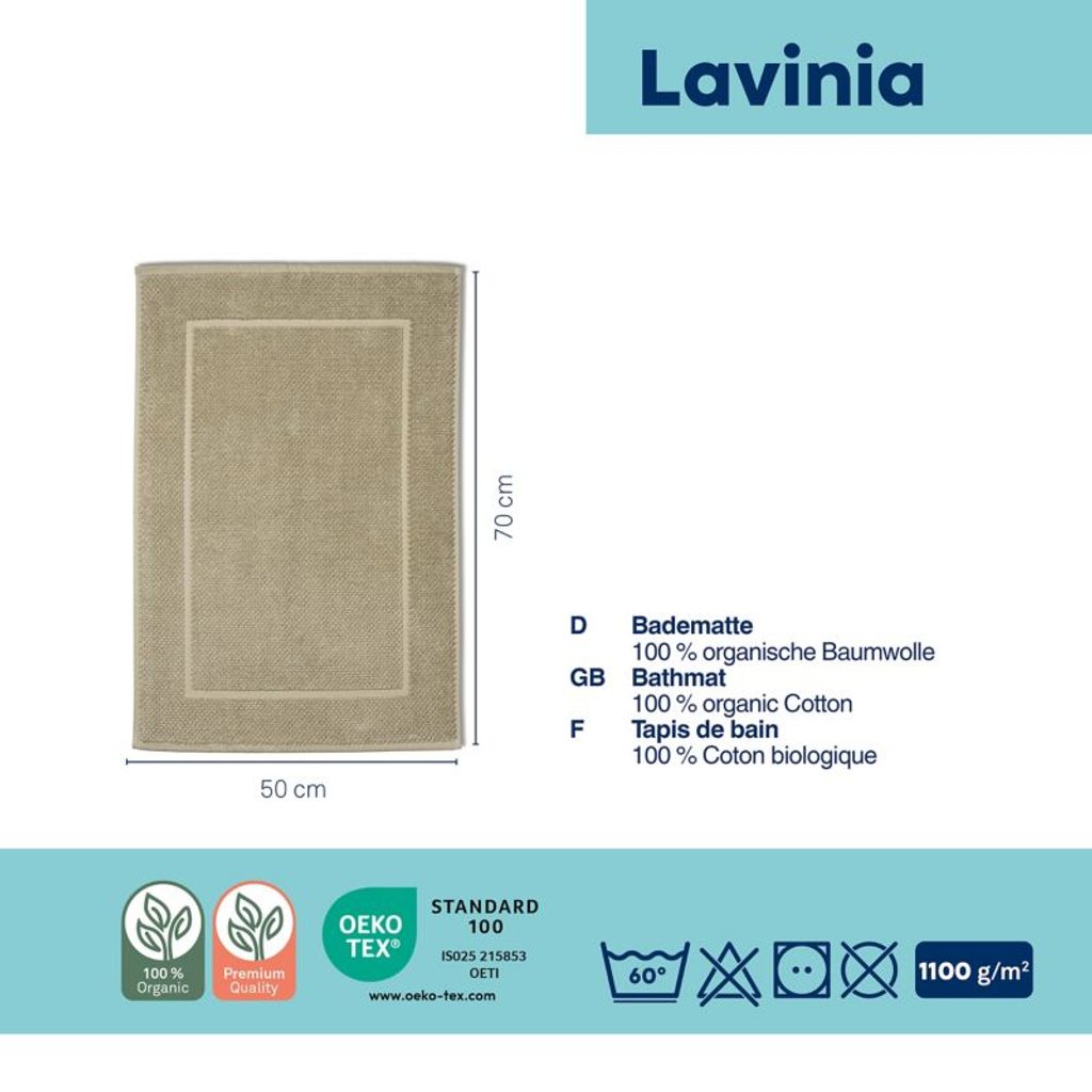 Představujeme Vám luxusní koupelnovou předložku LAVINIA od značky KELA. Tato předložka je vyrobena z 100% biobavlny, což zaručuje měkkost a příjemný pocit na dotek. S vysokou kvalitou materiálu o hmotnosti 1550 g/m2 poskytuje vynikající komfort a odolnost. LAVINIA je nejen funkční, ale také stylová. Snadná údržba je samozřejmostí.