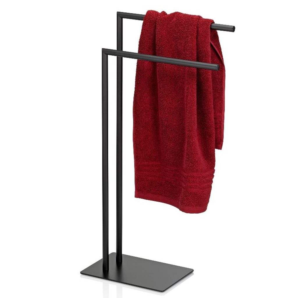 KELA Kovový věšák na ručníky černý ve tvaru L 30x20x81cm KL-22495 Elegantní a tvarovaný – držák na ručník STYLE v černé barvěDržák ručníku je díky své obdélníkové základně a 2 mírně posunutým držákům na ručníky ve tvaru L elegantní a tvarovaný. Dodejte své koupelně moderní nádech – s matně černými doplňky ze série Style.Gumové nožičky na spodní straně věšáku na ručníky zajišťují stabilní stojan.Klozetový set STYLE je k dispozici také v ladícím s věšákem na ručníky STYLE a obě varianty jsou dostupné i v chromovaném lesklém vzhledu ve stříbrné barvě.Držák na ručník Style vyrobený z kovu, matný práškový lak. Rozměry: 30 x 20 x 81 cm.