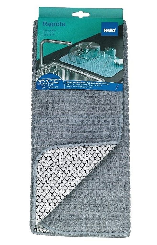 KELA Odkapávací podložka na nádobí RAPIDA 50 x 39 cm šedá KL-11642 Praktická odkapávací podložka pod nádobí je velmi užitečným kuchyňským pomocníkem. Používá se místo klasického odkapávače, nádobí se po umytí rozloží na podložku a nechá oschnout. Je lehká, skladná, měkká a skvěle zachycuje vodu. Odkapávací podložka je vyrobena z rychleschnoucího materiálu, můžete ji také vyprat v pračce. Jistě oceníte, že lze kdykoliv složit a znovu rozložit, výrazně tím ušetříte prostor na kuchyňské lince i při skladování. Ideální také pro menší prostory, kde není místo na pevně stojící odkapávač. Zároveň ji lze použít jako podložku pod pevný odkapávač, který nemá spodní tác na odtékající vodu.- podložka na odkapávání umytého nádobí od německé značky KELA- rychleschnoucí a skvrnám odolný materiál- měkká a šetrná k nádobí- šetří místo v kuchyni i při skladování- kdykoliv připravená k použití- vhodná k praní v pračce na 40°- barva: světle šedá- rozměry: 50 x 39 cm- značka: KELA