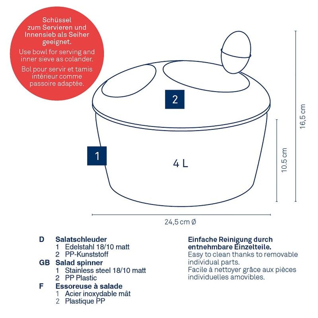 Miska o průměru 24,5 cm je nejen robustní a odolná, ale také všestranná. Můžete jej použít přímo k podávání vašich salátů, zatímco vnitřní sítko slouží jako praktický cedník.