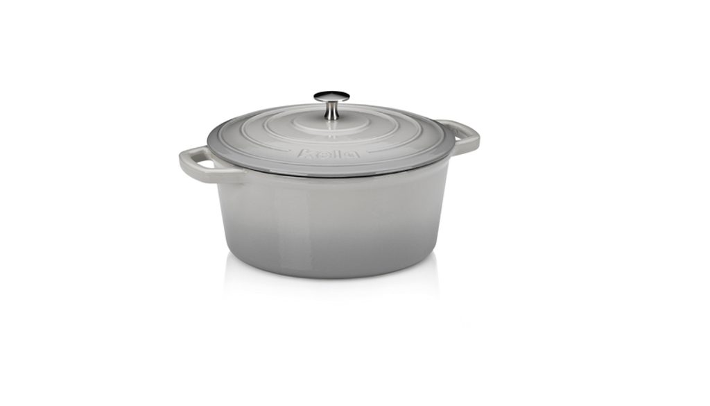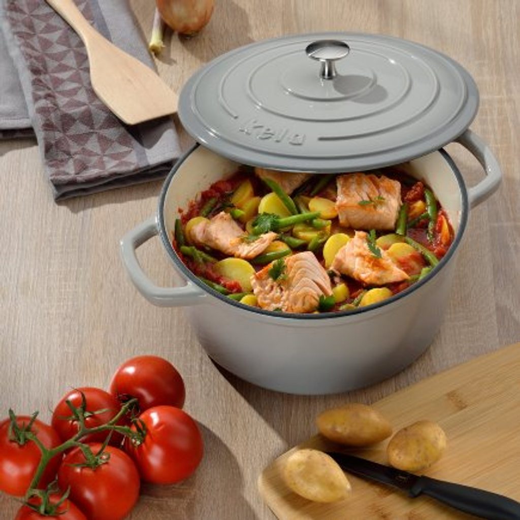 KELA Pekáč litinový s poklicí CALIDO 26 cm šedá KL-12607 Trendy nádobí s dlouhou životností ze série kela Calido: kulatý pekáč s lesklým povrchem a poklicí má průměr 26 cm a pojme 4,6 litru. Tento šedý kastrol je vyroben z litiny a má béžově smaltovaný vnitřek. Pekáč je ideální pro opékání masa (do 300°C) a pro dušená jídla, která by se měla dusit ve vlastní šťávě po dlouhou dobu. Pekáč je součástí rozsáhlého sortimentu nádobí! Litinový smaltovaný světle šedý/béžový 26 cm , 12 cm v, 4,6 l