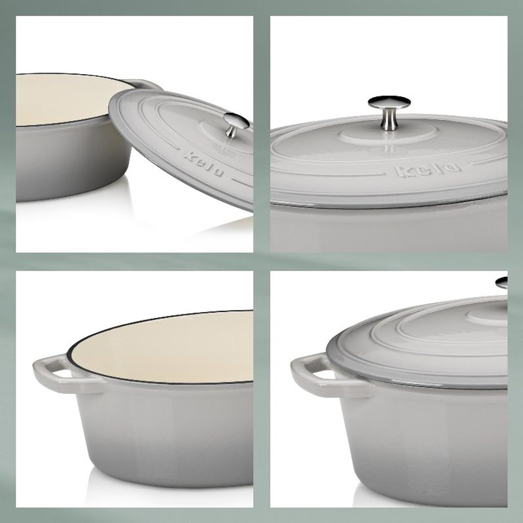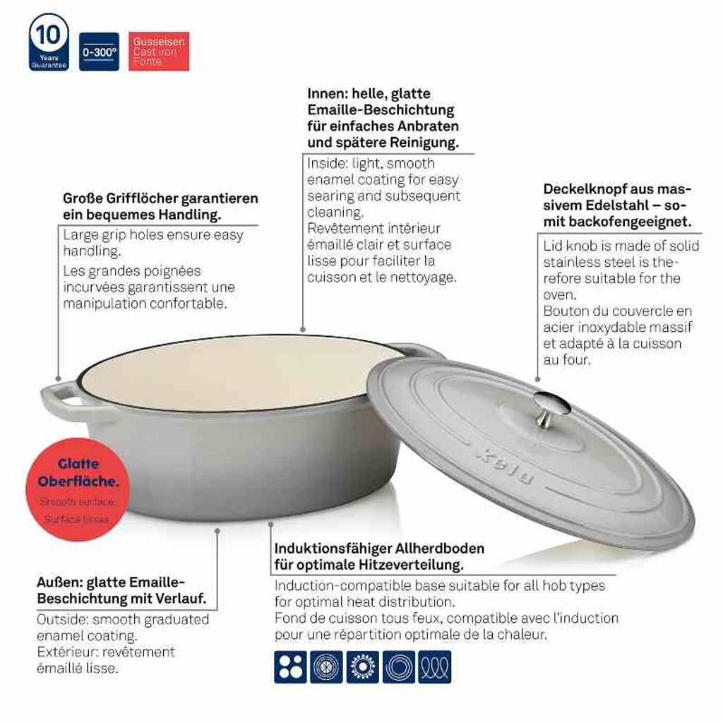 Pekáč litinový oválný s poklicí Calido 36x29 cm světle šedá se skvěle hodní na pečení pokrmů