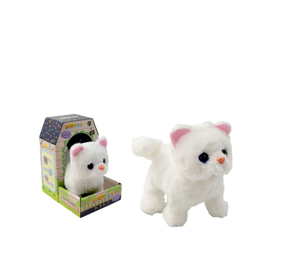 Kočička na baterie, která chodí, mňouká a hýbe ocáskem.