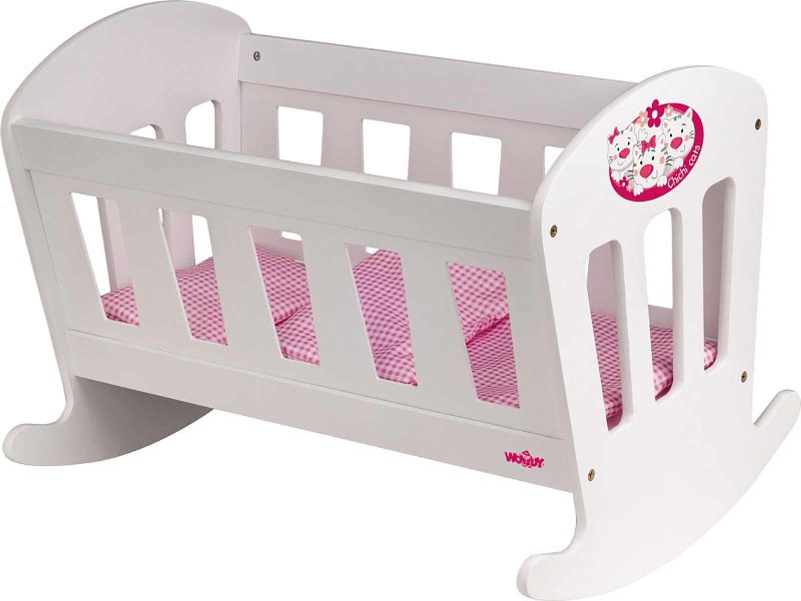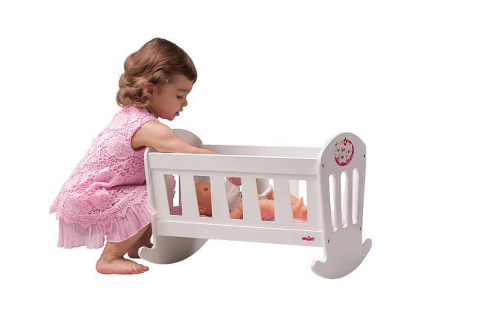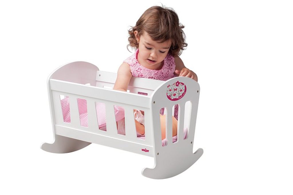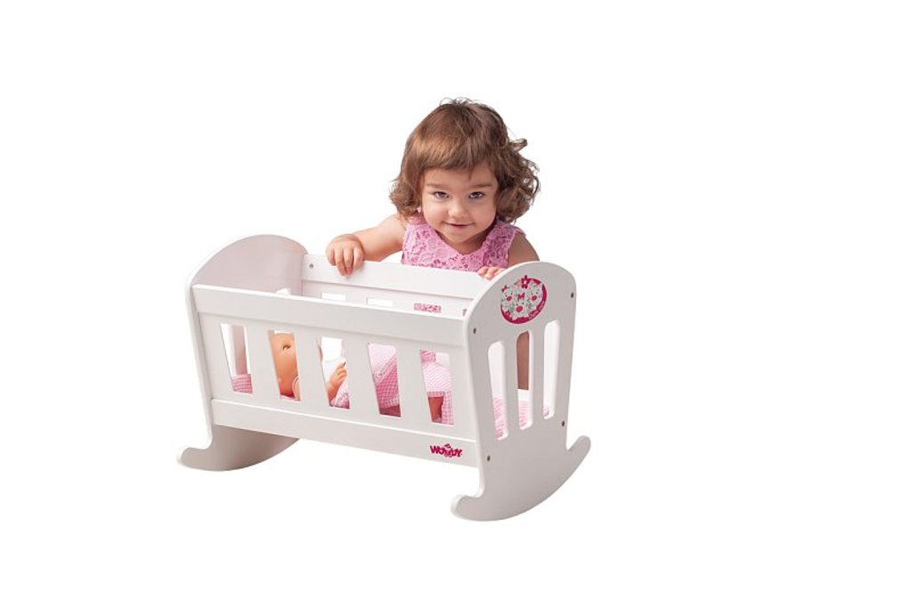Kolébka pro panenky z kolekce "Trendy"v bílé barvě vynikne v každém holčičím pokojíčku. Čela kolébky jsou jemně ozdobena kresbou růžové květinky.