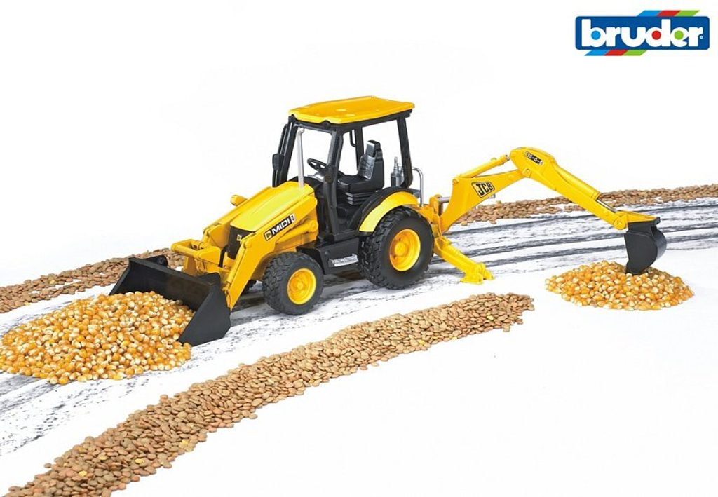 Konstrukční vozy - JCB MIDI CX nakladač 1:16. Tento model se vyznačuje především svou multifunkčností a všestranností. Spojuje takřka tři stroje v jeden: traktor, minibagr a čelní nakladač. Mezi jeho hlavní funkce a vybavení patří zejména přední lžíce a bagrovací rameno.Pro dokonalou stabilitu slouží opěrné nohy, které se dají odejmout. Zadní rameno můžeme snadno odejmout a přidělat traktorový závěs. Sedadlo pro řidiče je otočné. Vozidlo nepostrádá ani profilové pneumatiky, které jsou vhodné i pro náročnější terén. Celkově je vyrobeno z vysoce kvalitního plastu, který je odolný proti nárazu. Je vhodný ke hře doma i venku. Rozměry: 520 x 180 x 160 mm