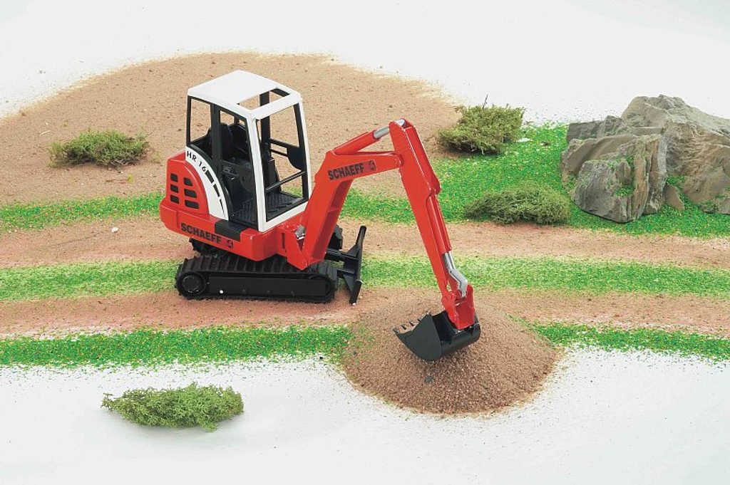 Konstrukční vozy - SCHAEFF HR16 mini bagr 1:16. Tento model minibagru je u dětí velmi oblíbený především díky plně funkčnímu bagrovacímu ramenu. Lžíce bagru se dá dle přání odejmout a přední radlice dle potřeby nastavit. Kabina je otočná až o 360 stupňů a gumový pás umožňuje snadný pohyb dopředu i dozadu i v náročnějším terénu. Celý model je vyroben z vysoce kvalitního plastu a vhodný pro exteriér i interiér. K tomuto modelu doporučujeme dokoupit příslušenství pod číslem 02408 pro rozšíření hracích kombinací. Rozměry: 350 x 160 x 100 mm