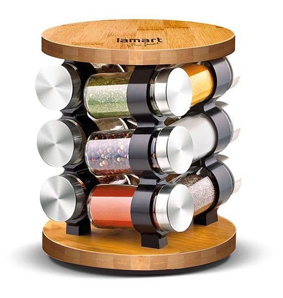 Sada kořenek na otočném bambusovém stojanu v moderním designu. Kořenky vyrobeny z odolného skla, vhodné i do myčky na nádobí bez víčka.