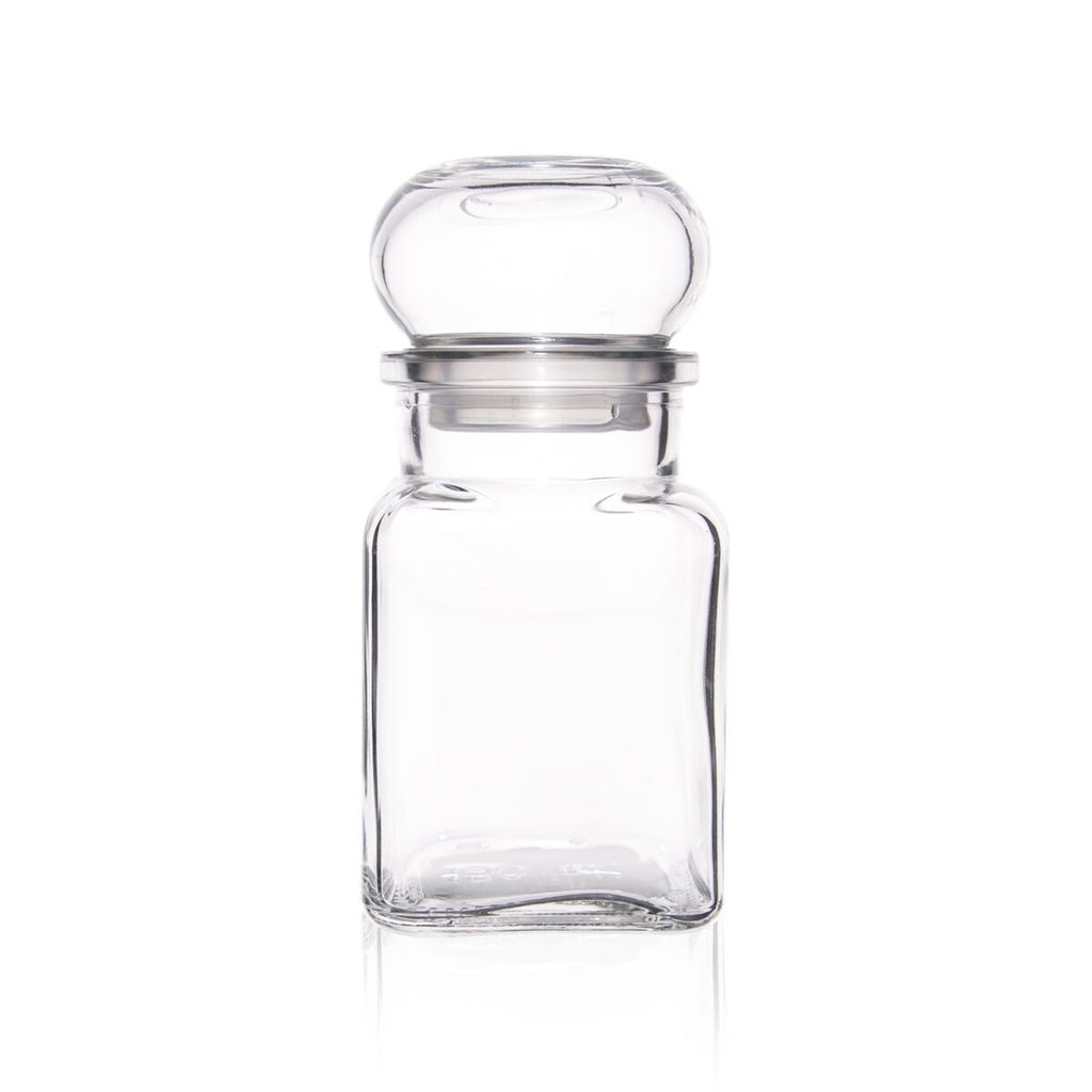 Kořenka s víčkem. Materiál: sklo. Rozměry: (šxhxv) 5,5x5,5x12 cm, objem 150 ml.
