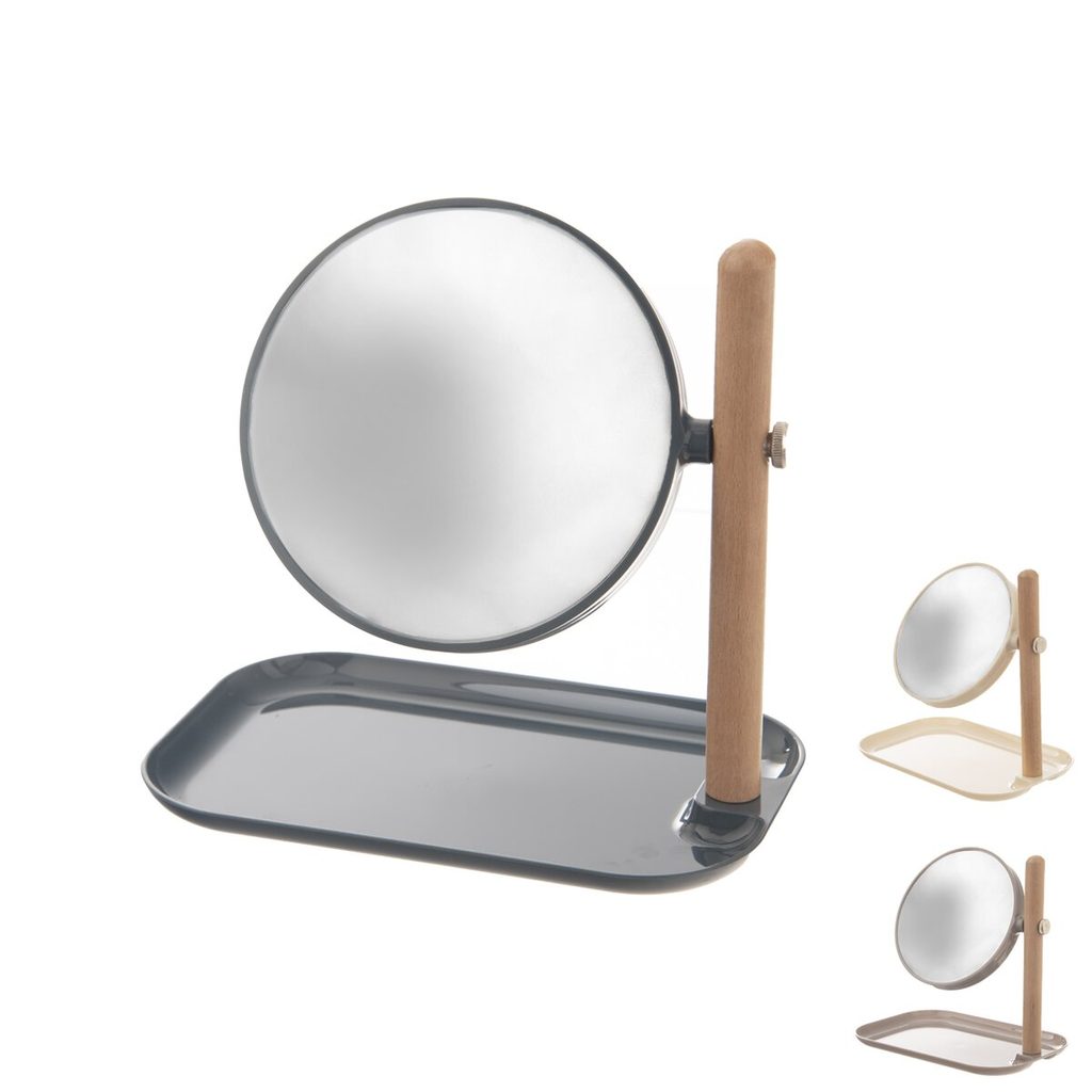 Zrcadlo na stojánku je oboustranné, jedna strana 3x zvětšuje obraz. Moderní design. Mix barev-béžová, kávově hnědá, modrošedá. Usnadní ranní líčení i jiné kosmetické úpravy obličeje. Stojánek slouží také jako mělký tácek na odkládání různých drobností – kosmetiky, šperků... Materiál: plast, bukové dřevo, sklo, kov. Rozměry: š. 22,5 cm, v. 23 cm, pr. 15 cm.