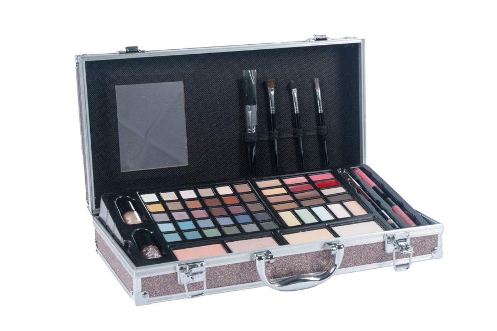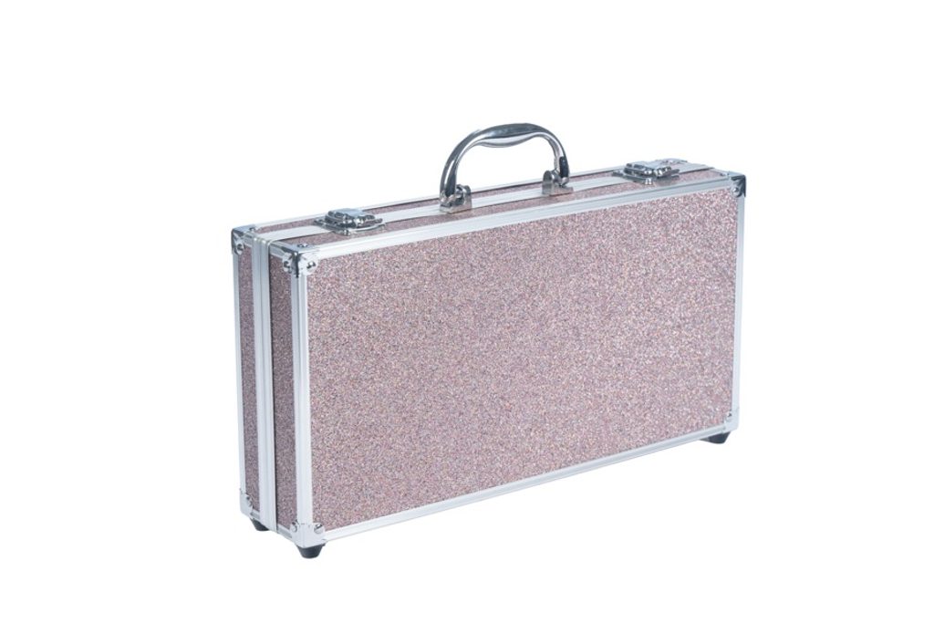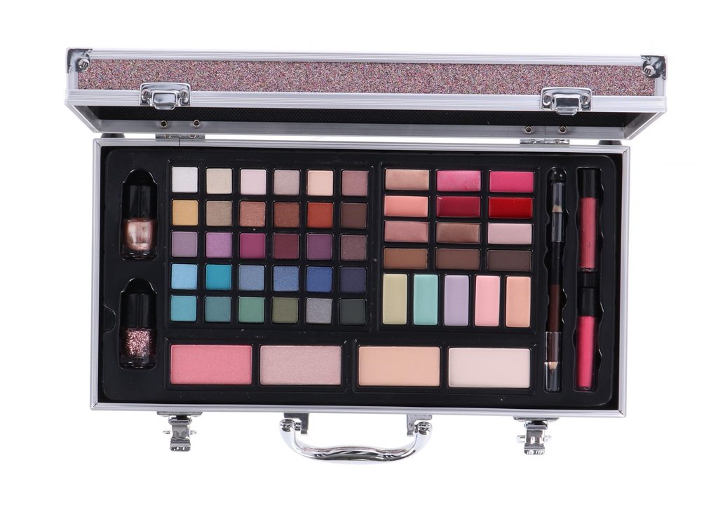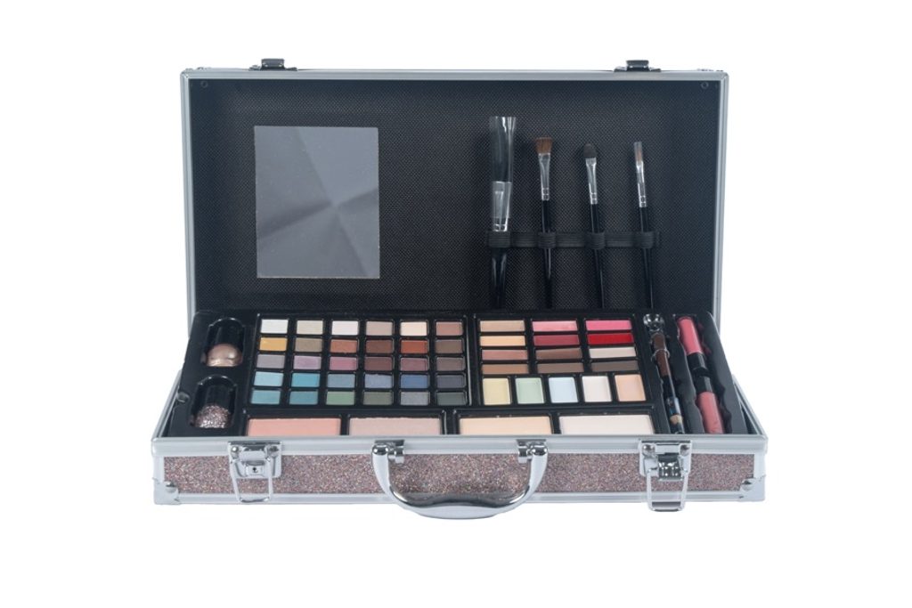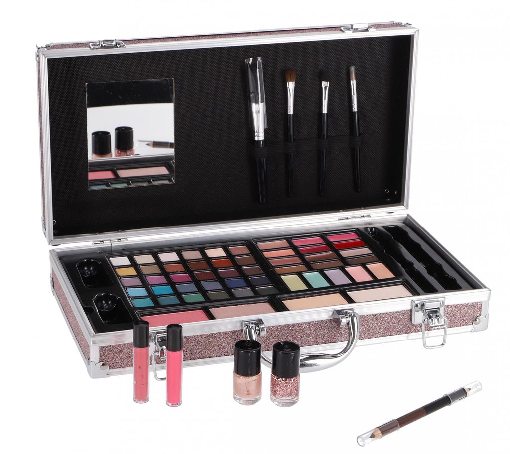 Kosmetický kufřík pro slečny obsahuje oční stíny, laky na nehty, rtěnky, tvářenky, tužky na oči, lesky na rty, štětečky a zrcátko.