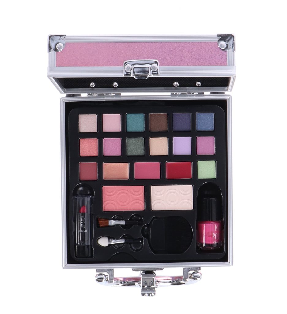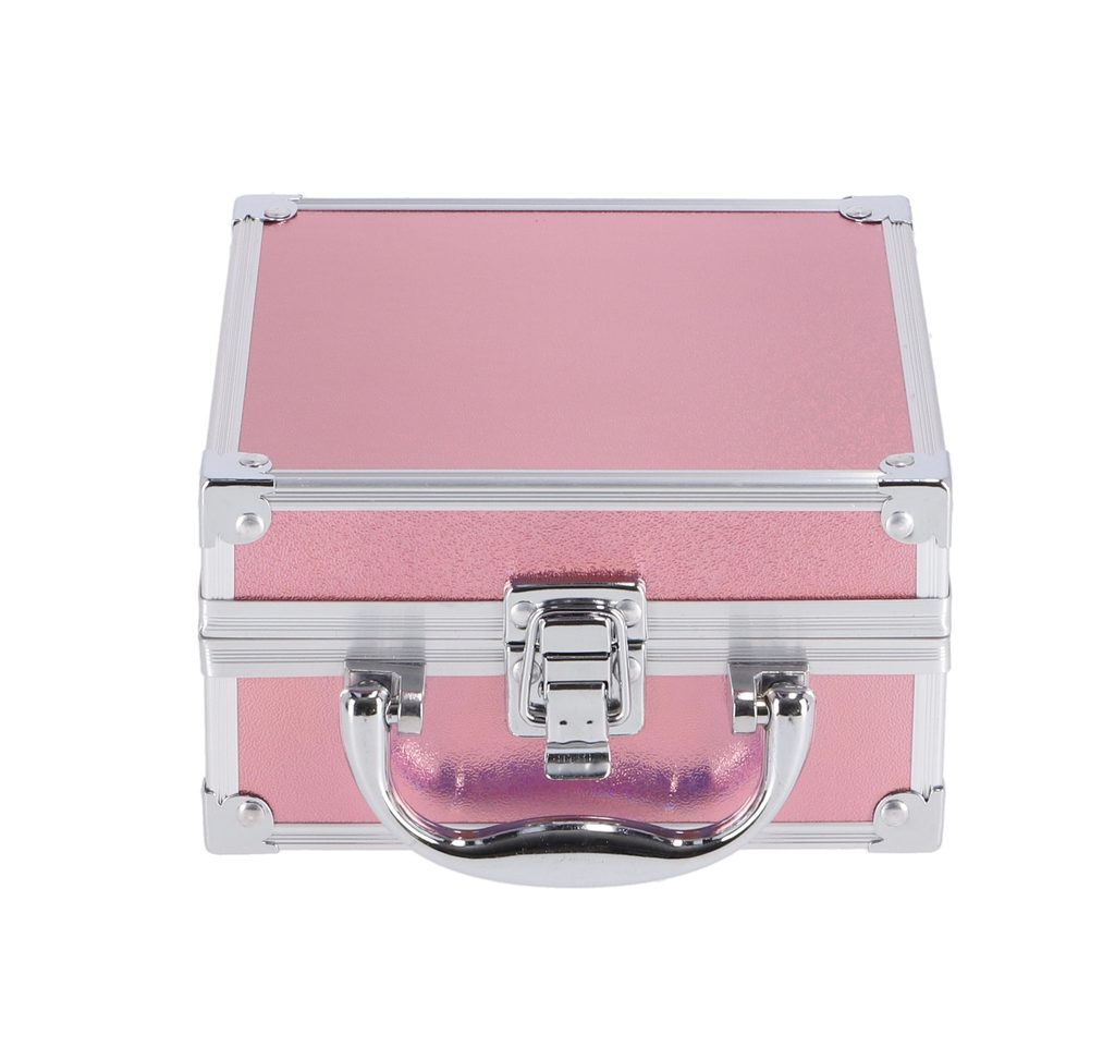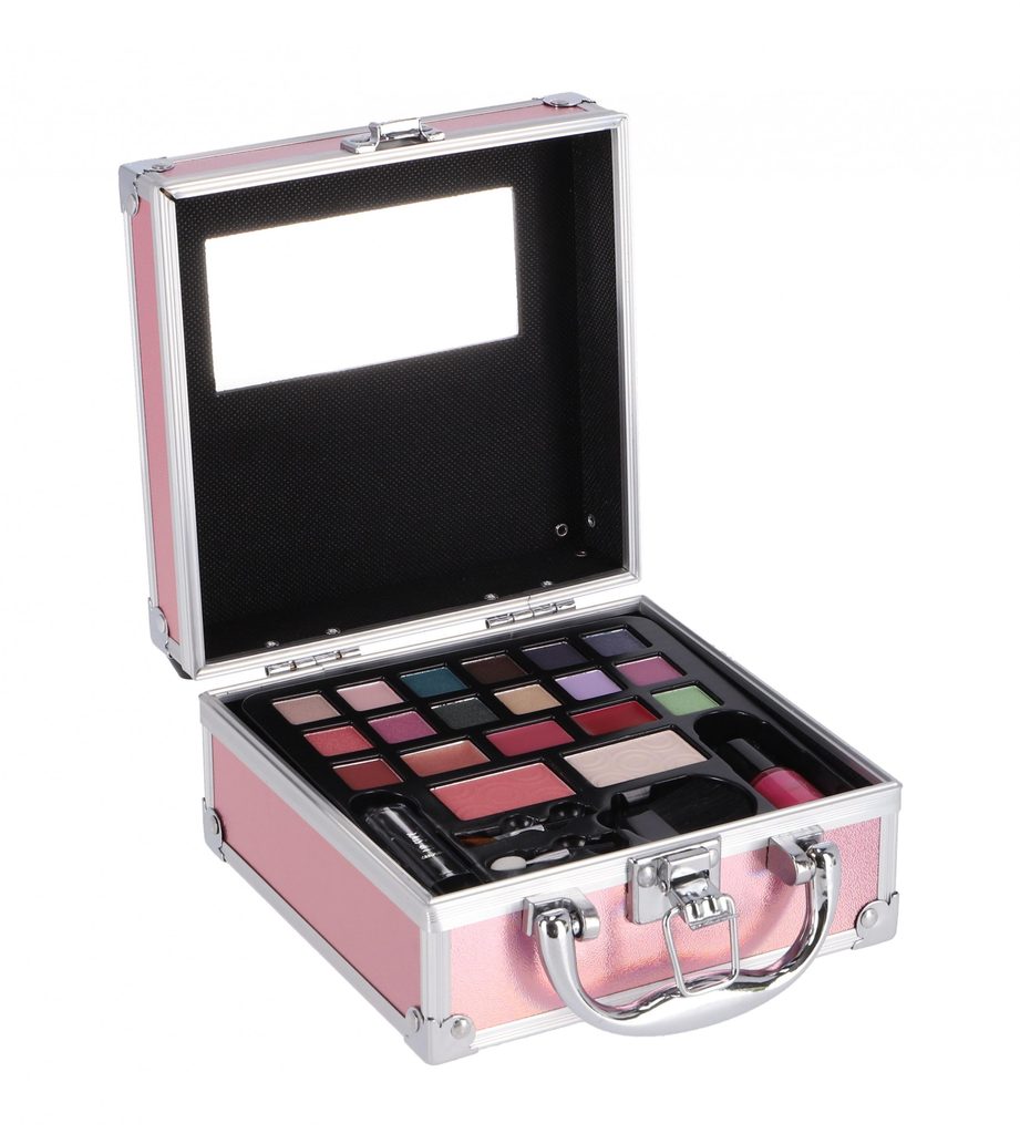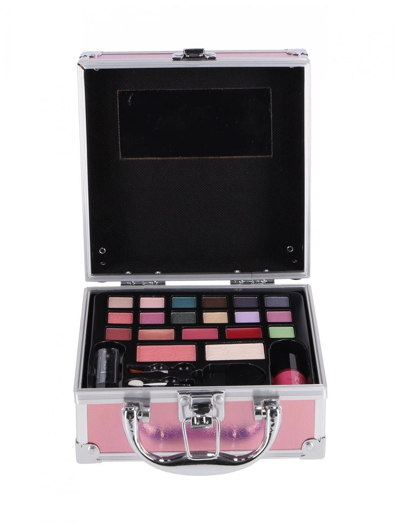 Hliníkový mini kosmetický kufřík s růžovým povrchem. Obsah: 1 x zrcátko, 14 x barvy očních stínů, 3 x třpytivé barvy na rty, 1 x tvářenka, 1 x pudr, 1 x rtěnka, 1 x lak na nehty, 1 x štětec na tvářenku, 1 x houbičkový aplikátor a 1 x štětec na rty.