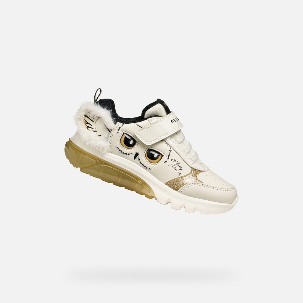 Dívčí tenisky Geox Ciberdron inspirované světem Harry Pottera v krémovém provedení s motivem sovy Hedviky. Stylové prvky jako dvě výrazné oči na boku, černé křivky připomínající obočí a zlatý třpytivý proužek dodávají teniskám jedinečný charakter. Svrchní část je doplněna praktickým suchým zipem s logem GEOX a hebkým kožíškem v oblasti paty.