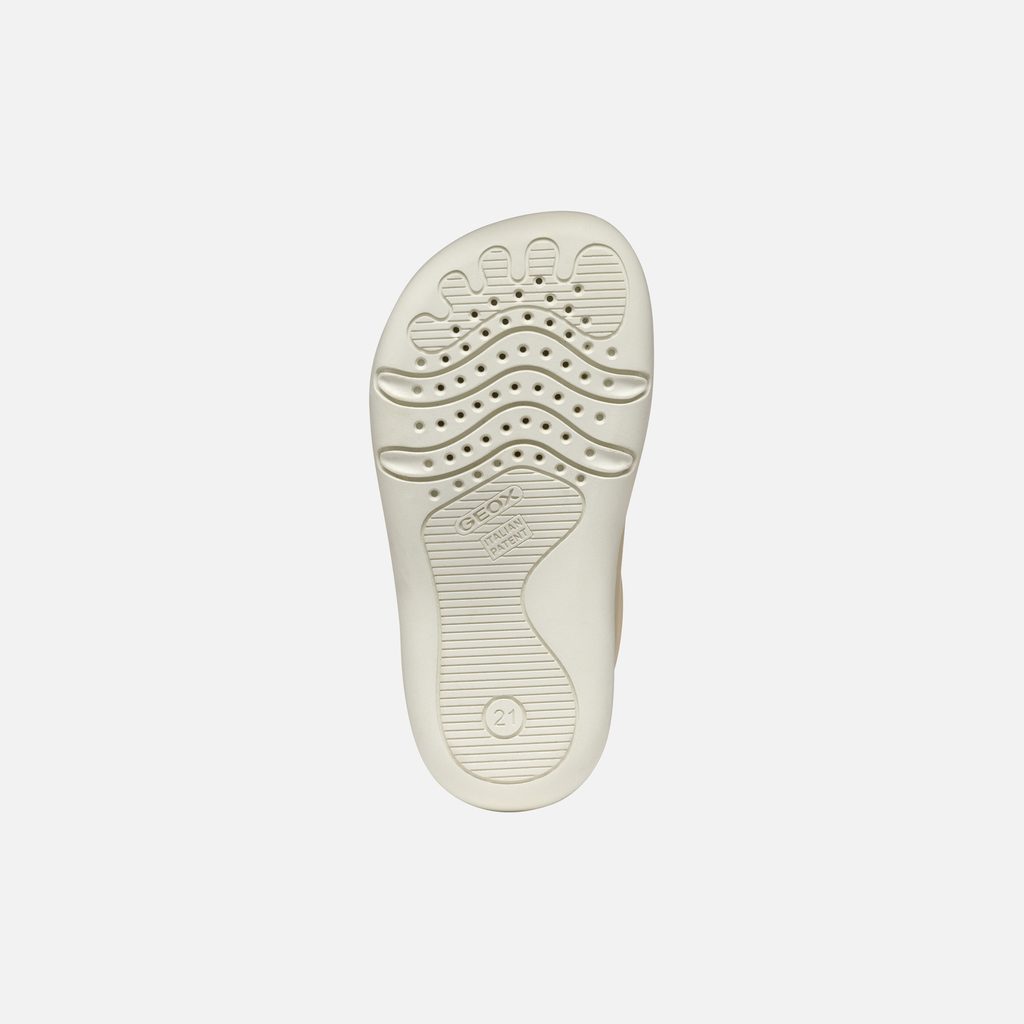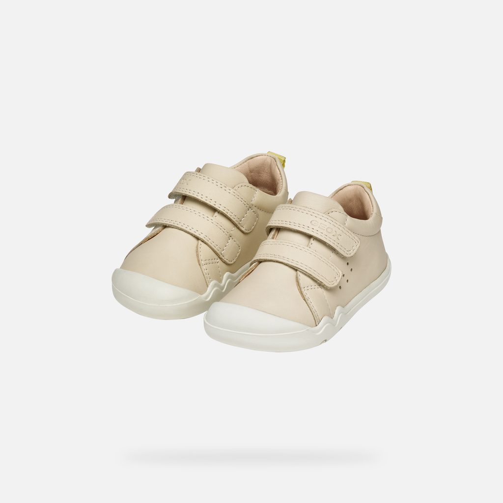 Krémové dívčí tenisky Geox Steppieup, vyvinuté ve spolupráci s Asociací Italských Podiatrů, zaujmou praktickým designem s dvěma suchými zipy pro snadné nazouvání. Vrchní pásek zdobí logo značky Geox, zatímco žluté poutko na patě usnadňuje obouvání.