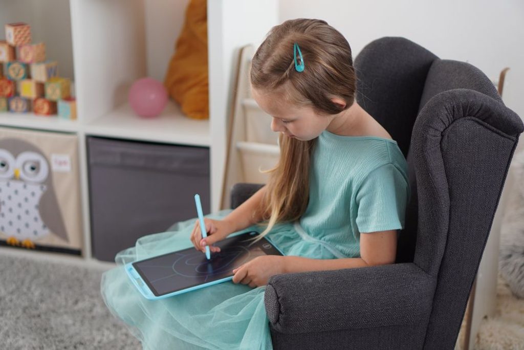 Kreslící tabulka - tablet. Přiloženou tužkou nakresli obrázek na tabulku a zmáčknutím jednoho tlačítka ho smaž. Tabulka je ve tvaru úzkého tabletu. Je moderní a designová. Má barevný podklad - nakreslené obrázky jsou na ní barevné.