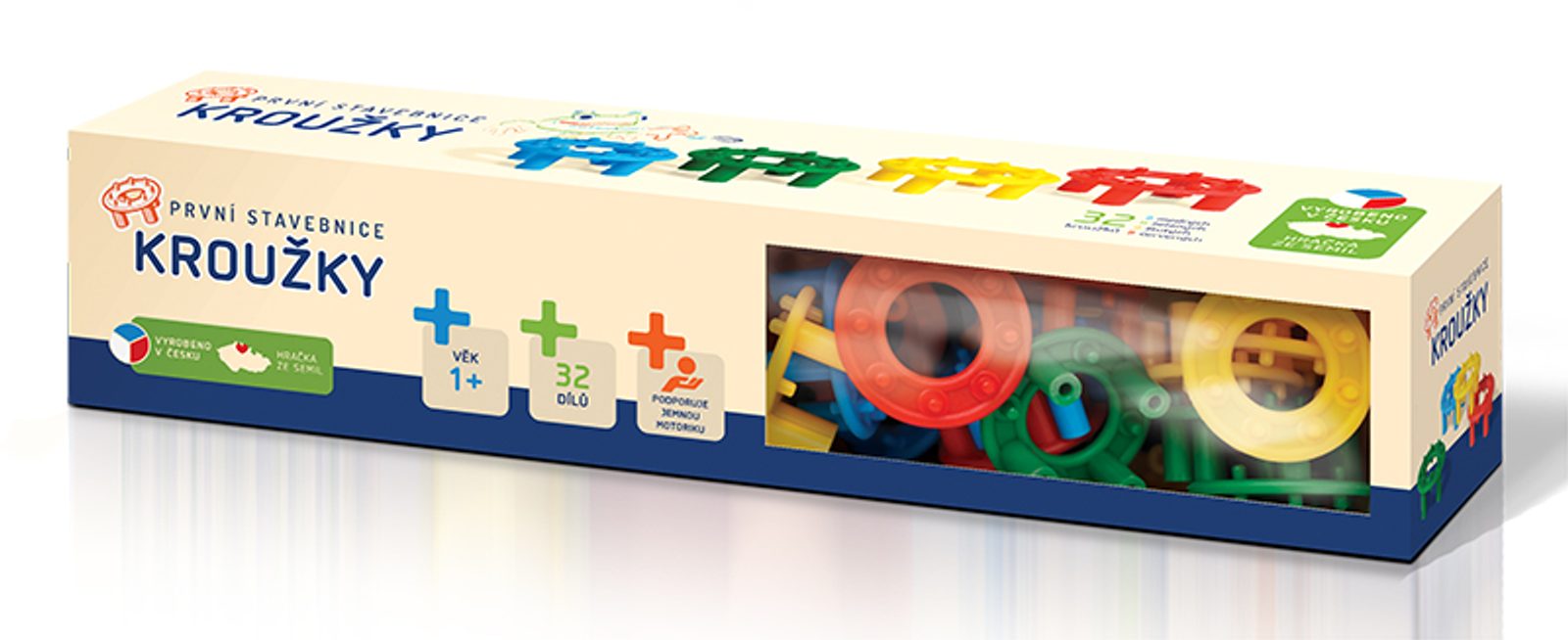 První stavebnice - Kroužky obsahuje 32 dílků – kroužků ve 4 barvách. Je vhodná již pro nejmenší děti od 1 roku. Pomáhá jim procvičovat cit v prstíkách a poznávat základní barvy.