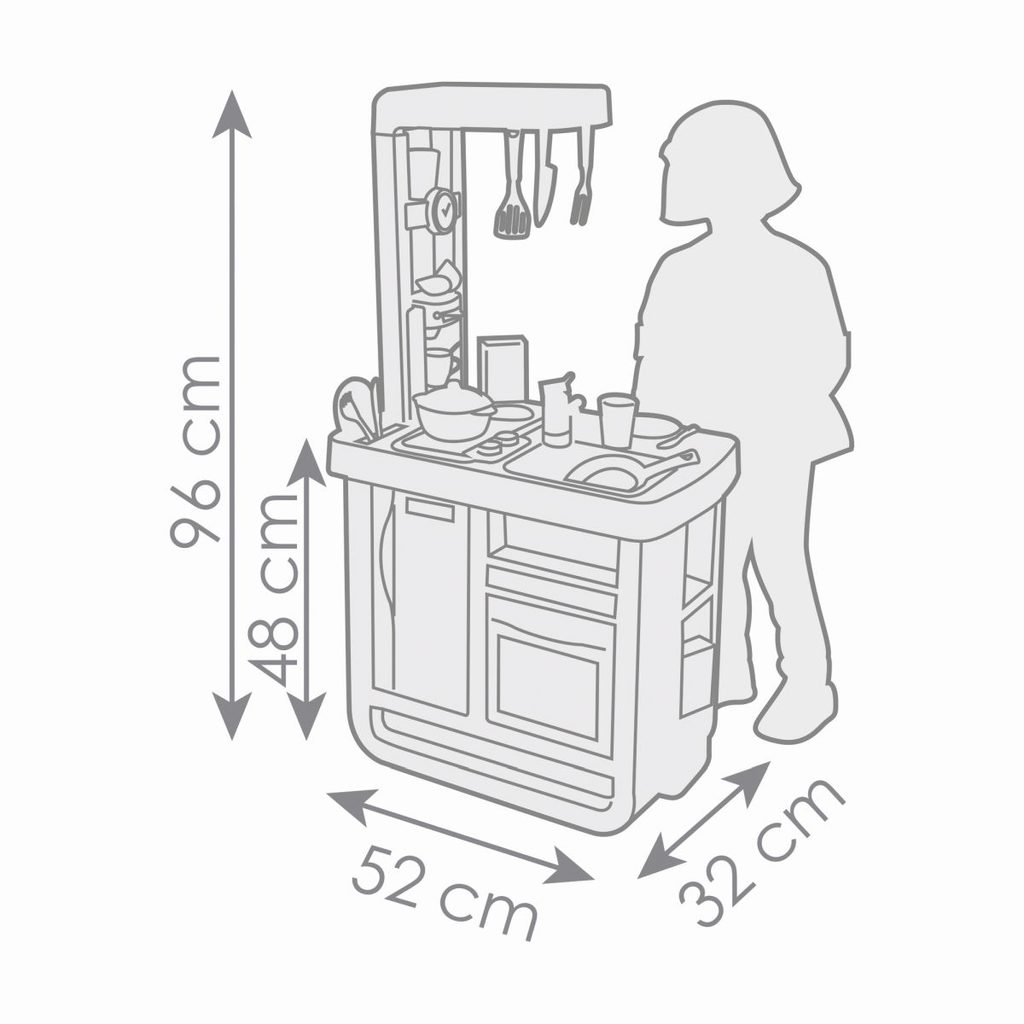 Kuchyňka Bon Appetit v moderním designu se spoustou kuchyňského příslušenství, 23 příslušenství. Kompaktní a realistická dětská kuchyňka, která je celá navržena v moderním designu současných kuchyní. Díky krásnému zbarvení v jemných pastelových tónech se hodí do dětského pokoje i do společného obývacího pokoje. Kuchyňka má sporák se dvěma plotýnkami, troubu a digestoř. Elektronický zvukový modul v jedné z plotýnek poskytuje realistické zvuky vaření. Výbavu doplňují lednice, dřez s kohoutkem a espresso kávovar s různými kapslemi na čaj a kávu. Rozsáhlé příslušenství lze snadno uložit do jedné z mnoha polic. Součástí vybavení je rendlík s poklicí, talíř, příbory, nádobí, makety obalů od jídla, hrnek, hrnek a pánev. Výška pracovní plochy: 48,5 cm. Rozměry produktu (DxŠxV): 52,1 x 32,5 x 95,7 cm.