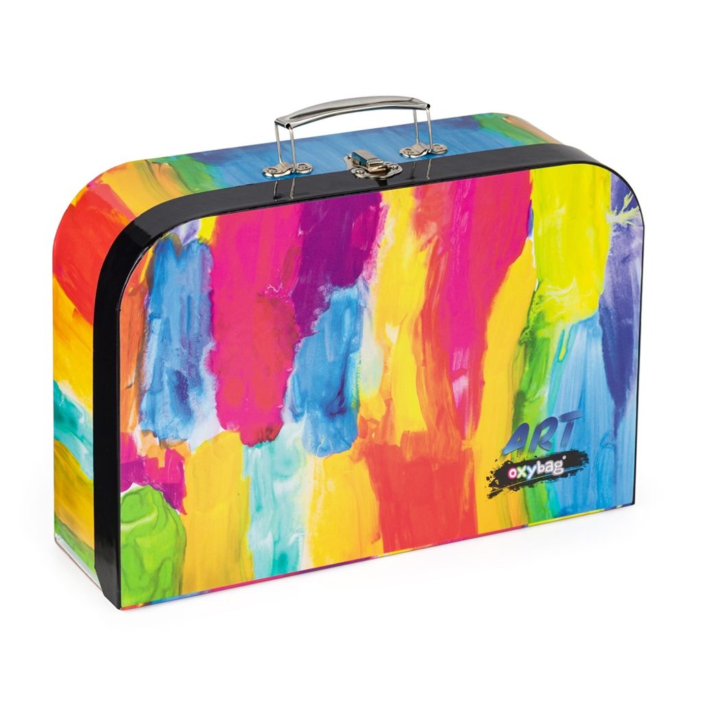 Lamino kufřík na výtvarnou výchovu. Do kufříku se vejde formát A4. Materiál: papír, lepenka, kovový zámeček, kovové nýty.