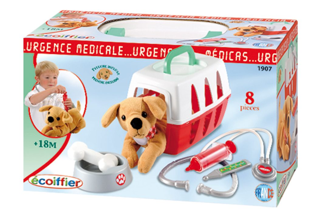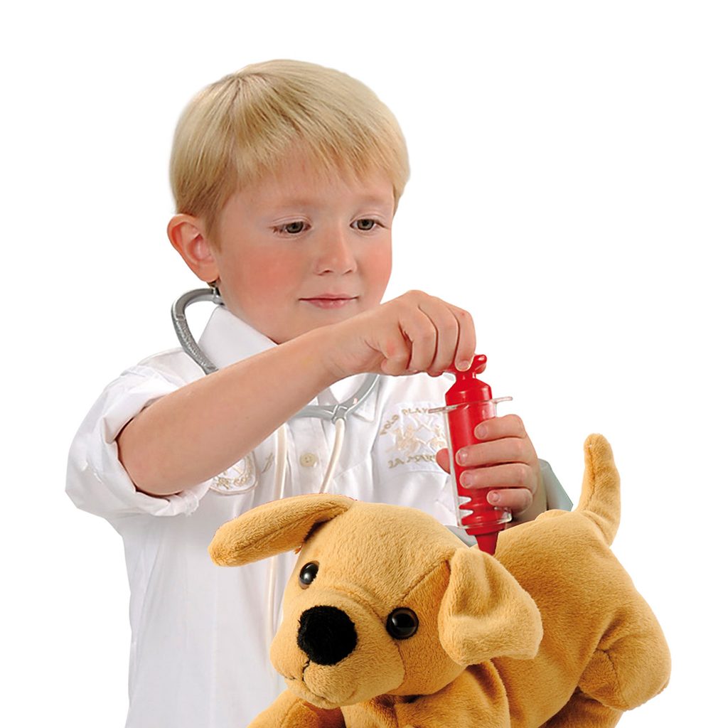 Kufřík pro malého veterináře s příslušentvím a pejskem. Kufřík lze použít jako přenosnou schránu pro pejska a také pro uskladnění příslušentví. Součástí např. miska pro pejska, kost, lékařské vybavení. Rozměry kufříku: 24 x 15 x 14 cm.
