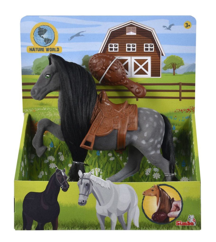 Velký kůň z řady Nature World ve 4 barevných provedeních s dlouhou hřívou. Velikost koně je 19 cm. Součástí je hřeben a sedlo.
