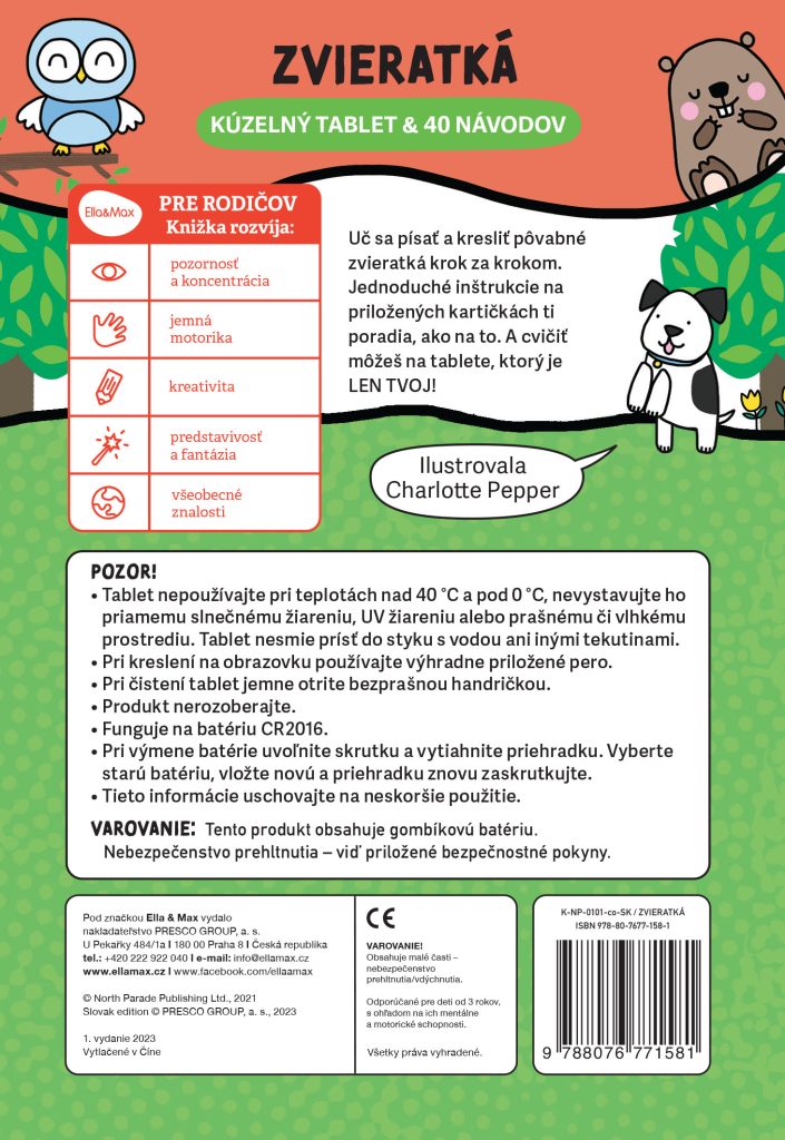 Učte se psát a kreslit roztomilá zvířátka krok za krokem. Jednoduché instrukce na přiložených kartičkách poradí vašim nejmenším jak na to. A cvičit mohou na tabletu, který je JENOM JEJICH! Chcete začít znovu? Žádný problém – stačí stisknout tlačítko mazání! Práce s výukovými kartičkami a tabletem rozvíjí pozornost a koncentraci, jemnou motoriku, ale také kreativitu, představivost, fantazii a v neposlední řadě všeobecné znalosti!