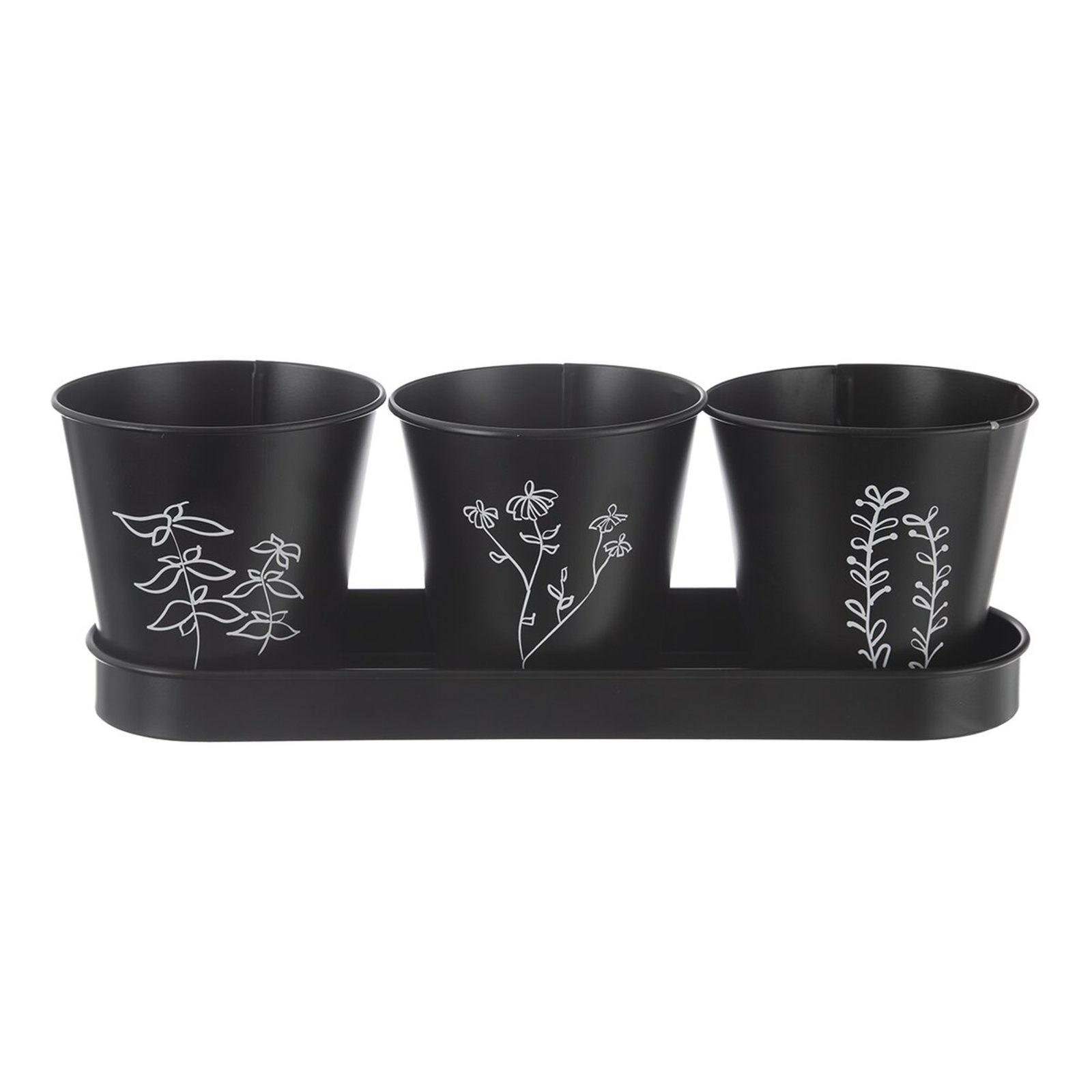 Set 3 květináčů na společném podtácku využijete především pro domácí pěstování čerstvých bylinek. Každý květináč je opatřen dírkou ve svém dnu, aby mohla přebytečná voda odtékat do podtácku a bylinky nebyly přelité. Barevně ladí s kolekcí BLACK, jsou opatřeny jemným bílým dekorem bylinek. Materiál: kov s povrchovou úpravou. Rozměry: 33x11x10,5 cm, květináč pr. 11 cm, v. 10,5 cm, podtácek 32x9x2,5 cm.