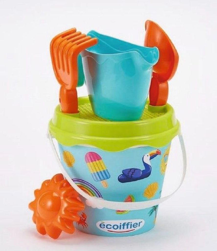 Set na písek s motivem prázdnin. Obsahuje kyblíček, sítko, hrabičky, lopatičku, konvičku a formičku. Průměr kyblíčku 17 cm, výška kyblíčku 18 cm.