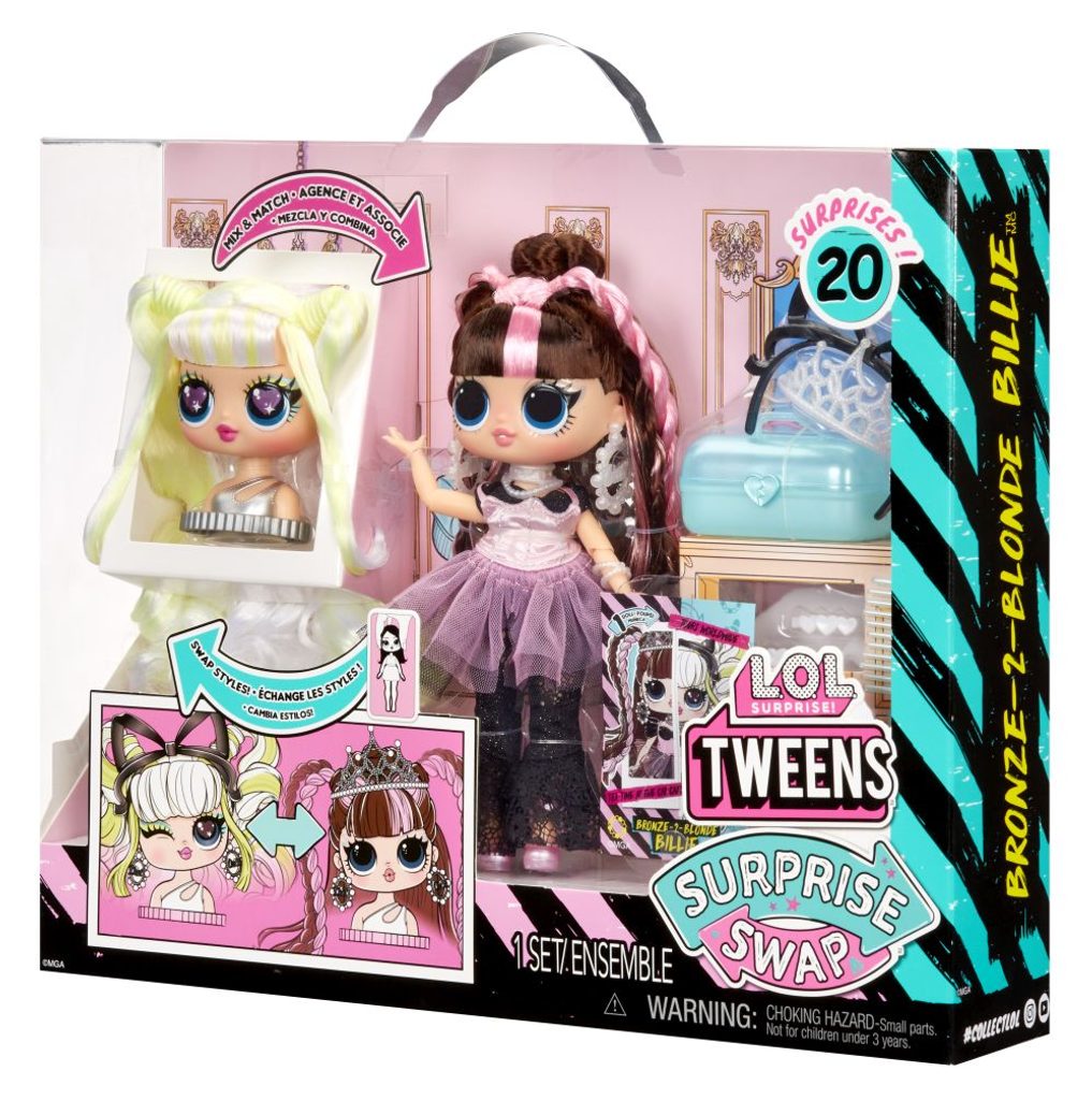 Získej 4 nové divoké a stylové Tweens panenky. V balení s panenkou najdeš mini česací hlavu a různé vlasové doplňky, díky kterým vykouzlíš dokonalý účes. Panence můžeš vyměnit hlavu podle toho, jaký styl se bude hodit k jejímu outfitu. Česací hlava má jiný výraz tváře, jinak barevné a jinak upravené vlasy. Můžeš kombinovat mezi všemi Swap Tweens panenkami.