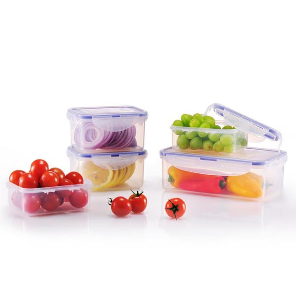 Sada 5 dóz lock s patentními víky. Dózy lock jsou bezpečné a funkční nádoby vyrobené z kvalitního plastu, který je trvanlivý a odolává vysokým teplotám. Tyto dózy jsou 100% vzduchotěsné a tím zajišťují dlouhodobou čerstvost uchovávaných potravin. Čtyři pohyblivé "klipy" zajišťující víko jsou odolné proti opotřebení. Dózy lock lze použít v chladničce, mikrovlnce nebo pro zmražování a lze je mýt v myčce na nádobí. Dózy lock prošly přísnými hygienickými zkouškami a odpovídají nejpřísnějším předpisům.Rozměry jednotlivých dóz: 2 dózy á 350 ml/13,5x10,2x5,2 cm2 dózy á 470 ml/13,5x10,2x6,8 cm 1 dóza á 1000 ml/20,5x13,4x6,9 cm.