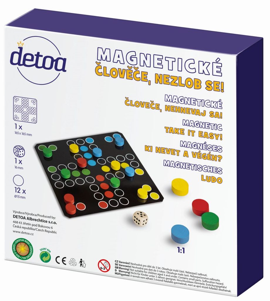 Magnetické Člověče, nezlob se! je známá desková hra pro děti i dospělé. Obsahuje 12 magnetických dřevěných žetonků o průměru 15 mm, hrací kostku o rozměrech 16 mm a herní plán. Vhodné od 5 let.