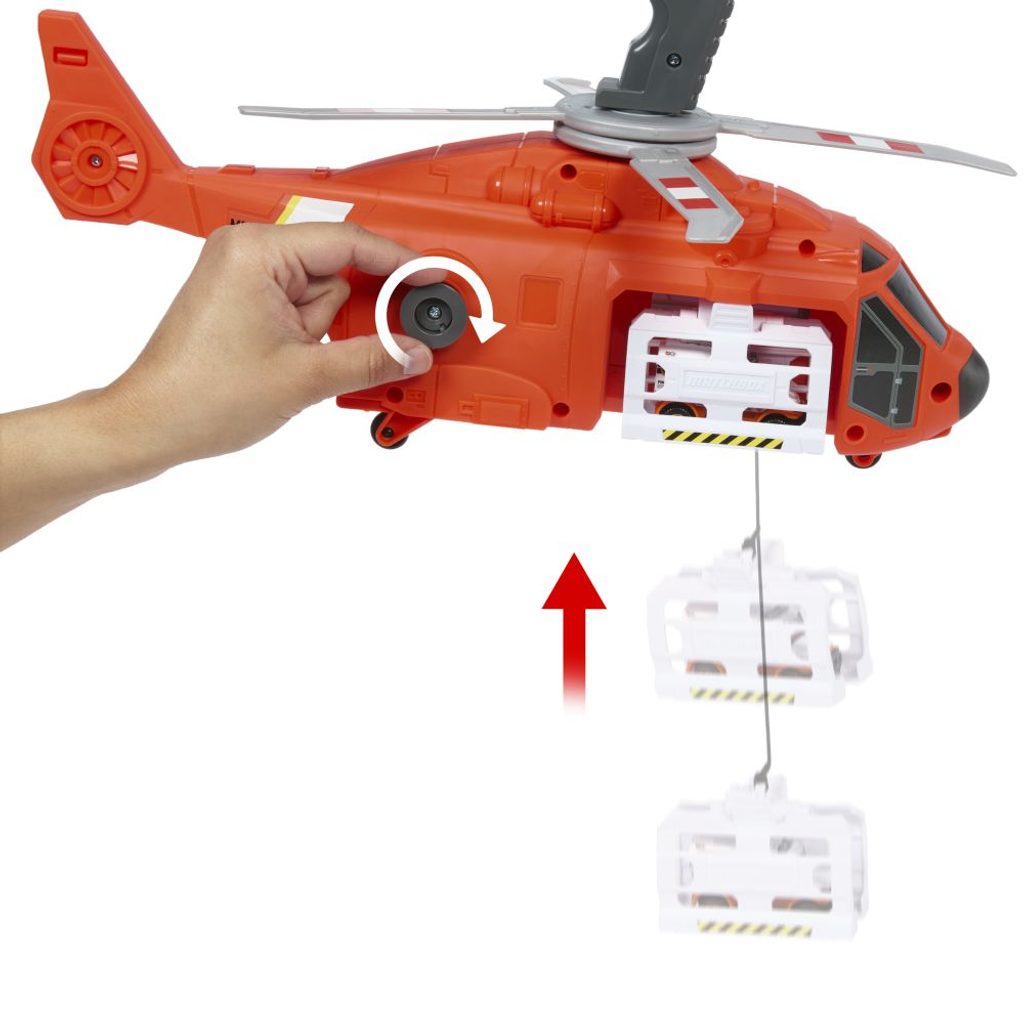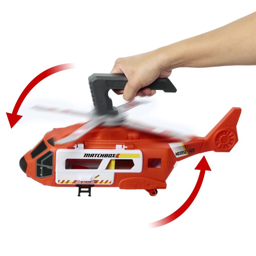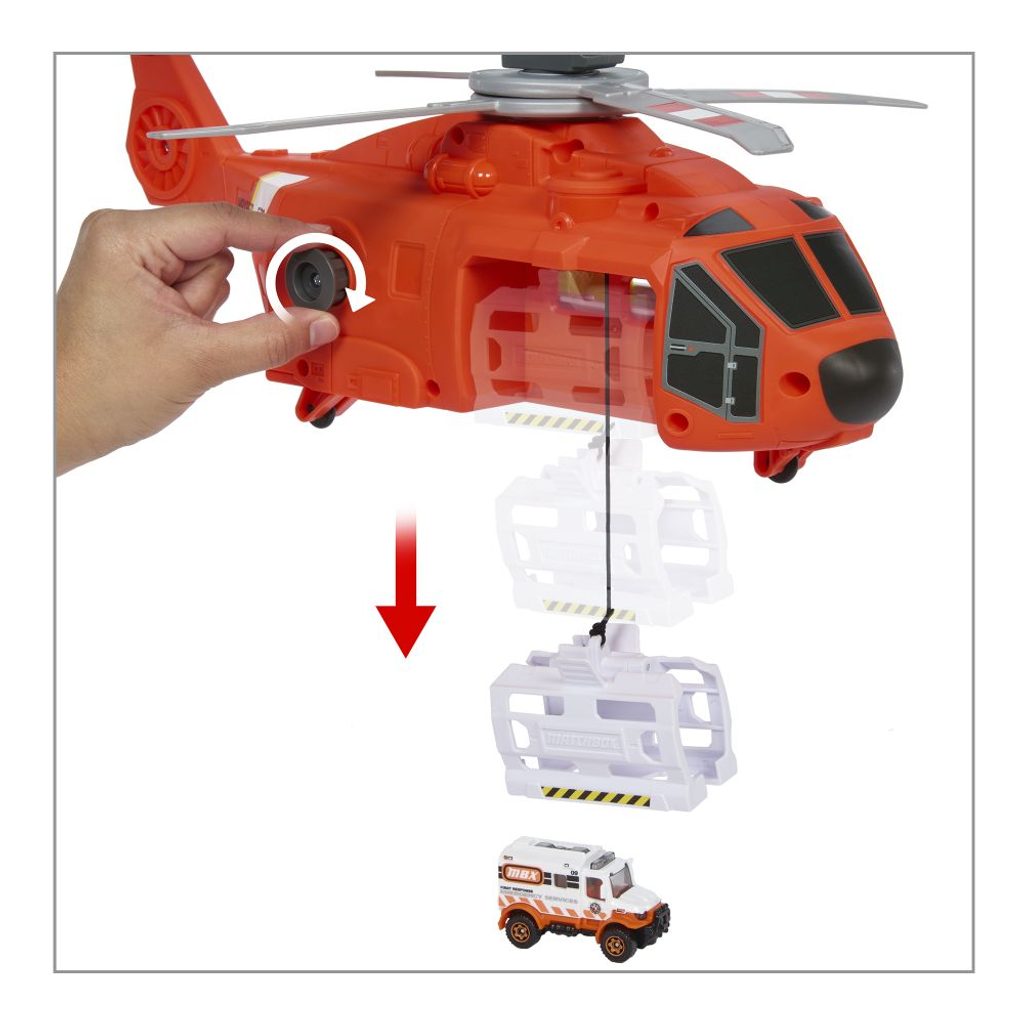Leťte se záchranným vrtulníkem Matchbox™ na pomoc! Tato cca 40 cm velká helikoptéra má vrtuli ovládanou dětmi, funkční naviják a lze ji proměnit v řídicí jednotku umožňující plnit záchrannou misi. Stisknutím páčky na rukojeti aktivujete vrtuli a "vletíte" na místo zásahu. Ze vzduchu spustíte naviják a zvednete autíčko v měřítku 1:64, které přenesete na palubu a zachráníte tak situaci. Součástí je kovová sanitka v měřítku 1:64. Leťte se záchranným vrtulníkem Matchbox™ na pomoc! Tato cca 40 cm velká helikoptéra má vrtuli ovládanou dětmi, funkční naviják a lze ji proměnit v řídicí jednotku umožňující plnit záchrannou misi. Stisknutím páčky na rukojeti aktivujete vrtuli a "vletíte" na místo zásahu. Ze vzduchu spustíte naviják a zvednete autíčko v měřítku 1:64, které přenesete na palubu a zachráníte tak situaci. Součástí je kovová sanitka v měřítku 1:64.
