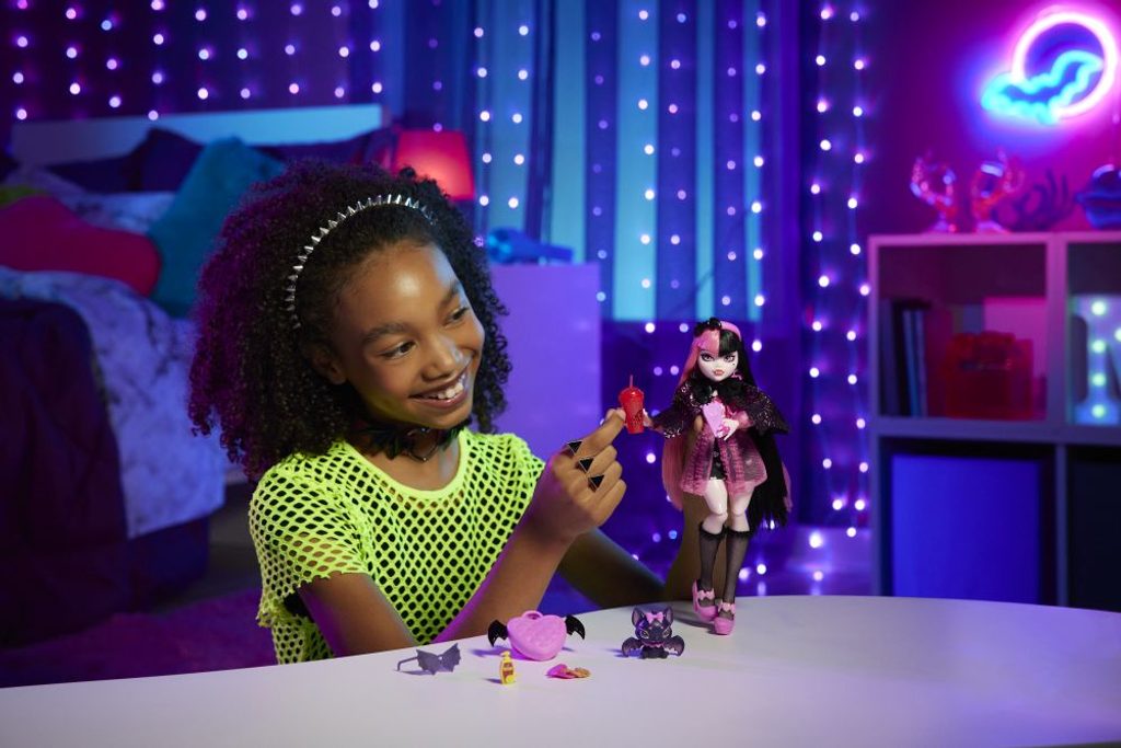 Škola je opět v plném proudu a lehce přízrační studenti z Monster High™ dokáží dát školní uniformě pěkně na frak! Draculaura™ se prochází po chodbách Monster High™ jak po přehlídkovém mole ve famózních kraťasech s cool srdíčkovým potiskem a korzetové halence s průsvitnými rukávy, která je přesně podle poslední upírské módy. Nechybí ani síťované punčochy, růžové boty na vysoké platformě, čelenka, ikonické sluneční brýle inspirované netopýřím lookem a elegantní temná kápě. Roztomilý mazlíček Count Fabulous™ doplňuje tuto krásnou rebelku. Panenka nemůže stát samostatně. Barvy a provedení se mohou lišit.