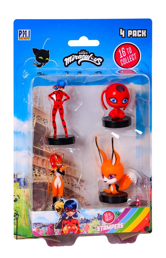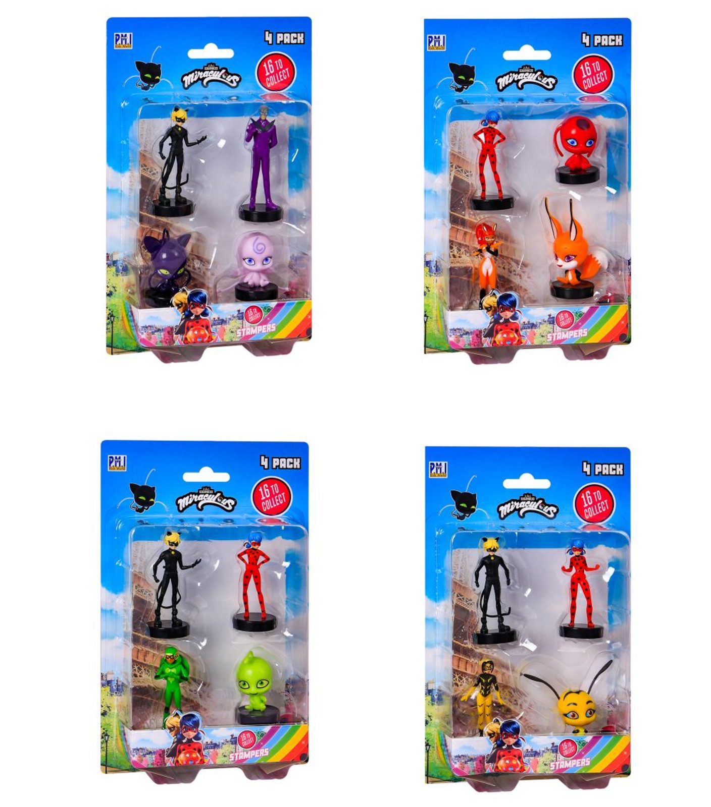 Čtyři kouzelné figurky z pohádky Miraculous: Beruška a černý kocour s razítky. Tyto figurky mají ve spodní části razítka, takže děti si mohou ozdobit školní práce, vytvořit nové obrázky a další. Vhodné pro děti od 3 let.